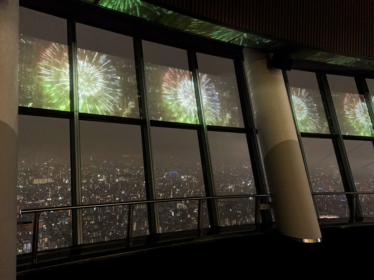 地上350メートルにある天望デッキの窓ガラスを巨大スクリーンに仕立てた「SKYTREE ROUND THEATER(R)」において、期間限定で「隅田川花火大会 from TOKYO SKYTREE(R)」が上映される。実際の隅田川花火大会の打ち上げ花火の音とともに大画面に花火が映し出され、臨場感あふれる映像を鑑賞できる。