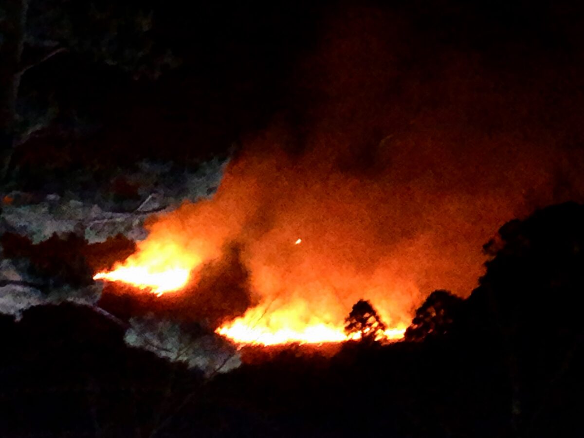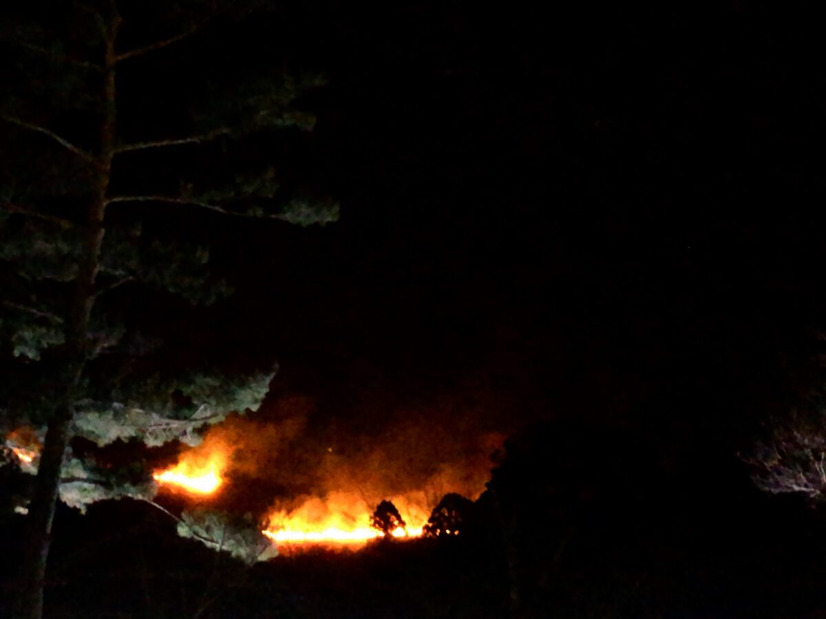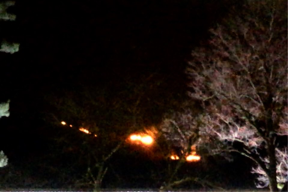 18時17分頃から徐々に、若草山全体に火が回り始めます。若草山に炎が広がる様子は、暗い夜空の一部を赤みがかったオレンジが包んでいくよう。生き物のような躍動感に満ちたオレンジの炎がその範囲を広げ、巨大な炎が追いかけてくるかのような、緊迫感すら感じます。
