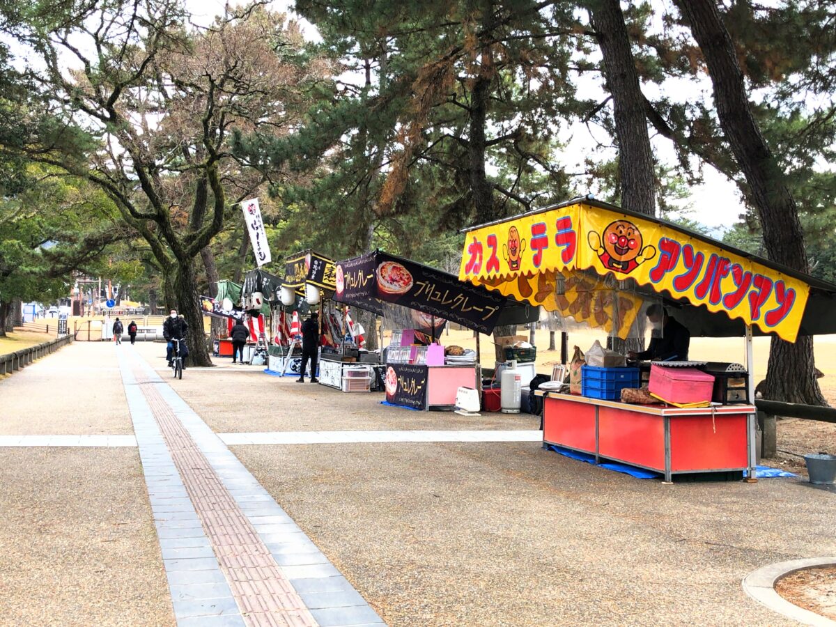 近鉄奈良駅から地上に上がってすぐのあたりから奈良公園までの歩道には、たくさんの屋台が軒を連ねています。歩道が広いので、屋台同士の間隔もしっかりとっており、三密対策も万全なので安心して屋台を楽しめますね。