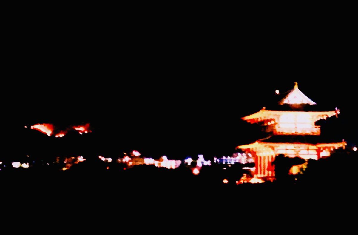 ライトアップされた朱雀門の背景に、燃え盛る炎に包まれた若草山が見えます。高い建物に視界を遮られることもなく、街灯もほとんどない平城宮跡からみると、漆黒の闇に浮かび上がる若草山が荘厳に輝きます。