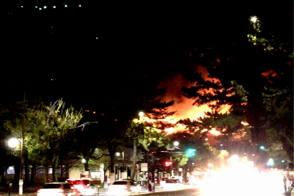 18時17分頃から徐々に、若草山全体に火が回り始めます。若草山に炎が広がる様子は、暗い夜空の一部を赤みがかったオレンジが包んでいくよう。生き物のような躍動感に満ちたオレンジの炎がその範囲を広げ、巨大な炎が追いかけてくるかのような、緊迫感すら感じます。