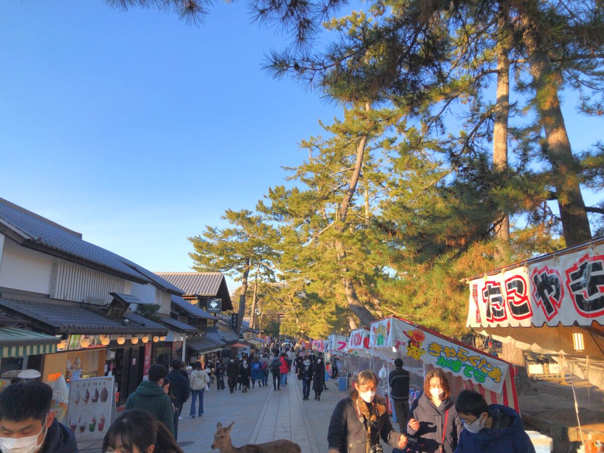近鉄奈良駅から地上に上がってすぐのあたりから奈良公園までの歩道には、たくさんの屋台が軒を連ねています。歩道が広いので、屋台同士の間隔もしっかりとっており、三密対策も万全なので安心して屋台を楽しめますね。