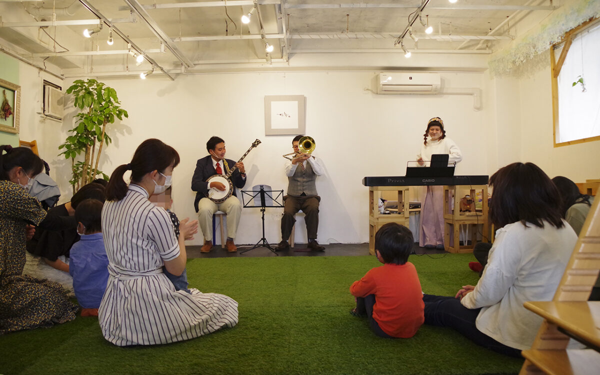 「weアートブロッサム」の開始と同時に行われたのは、「春いっぱいのリトミックコンサート」。我楽田工房を拠点にに活動している“ぐり~んりとみっく”が開催したもので、音に合わせて体を動かすリトミックを親子一緒に体験する、特別なコンサートです。