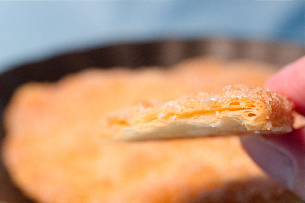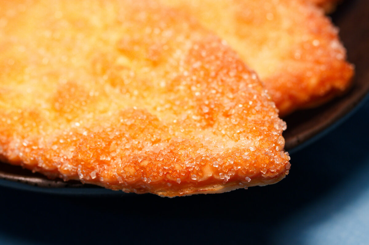 パリッと割ってみると、パイ生地が幾重にも折り重ねられているのがわかりますね。このままパクり!サクサクとした食感とともに、発酵バターのリッチな香りがじんわりと口いっぱいに染み渡ります。さらに、表面にまぶされた粒状の砂糖がゆっくりと溶けるので、芳醇なバター風味と、さらっとした甘味を贅沢に楽しむことができる逸品です。ただ、一部の店舗では取り扱いが無いのでご注意ください。