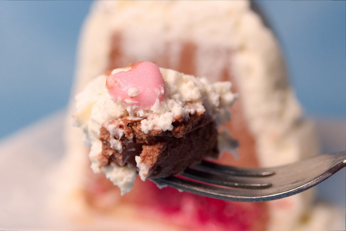 それでは最初の一口……。表面のホワイトチョコクリームは口溶けがよく優しい甘さ。アラザンやハートのチョコが食感のアクセントになっています。