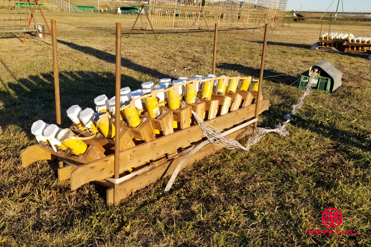 続いて打ち上げ花火。今回は最大4号なので一番大きな筒が4号筒です。筒の直径は約12cmになり中に入れる花火玉は一回り小さいのが一般的です。4号玉と言っても開花すると直径120mもの大きさに広がる花火なのです。