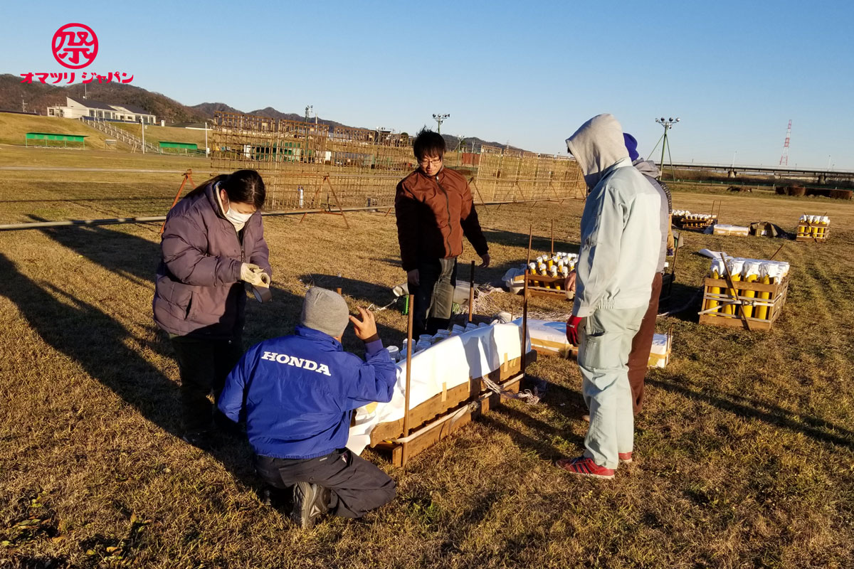 従業員の皆さんも寒い中でも準備に余念がありません。ここで使われている打ち上げ筒は通常のステンレス製ではなく、グラスファイバー製なので持ち運びは通常より楽なんだとか…。花火師の仕事は重労働なので少しでも負担が軽くなってほしいものです。