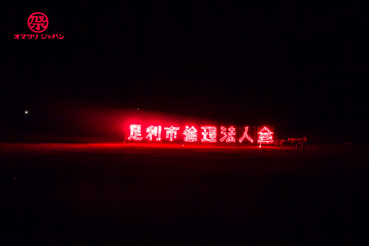 まず、観覧場所から正面に見えるのが枠仕掛け花火。スポンサーの企業名が花火で描かれています。10万円の協賛金でやってくれるそうです。