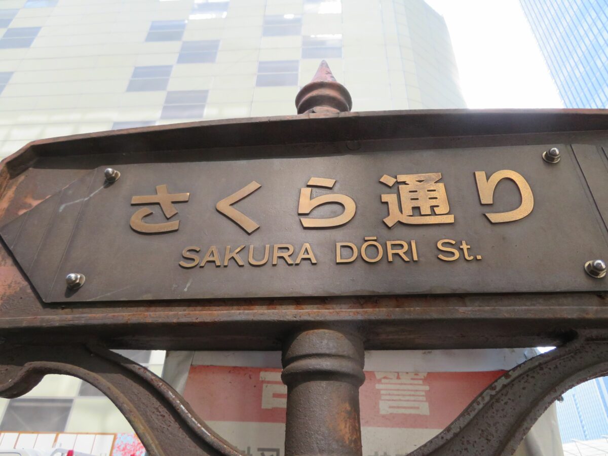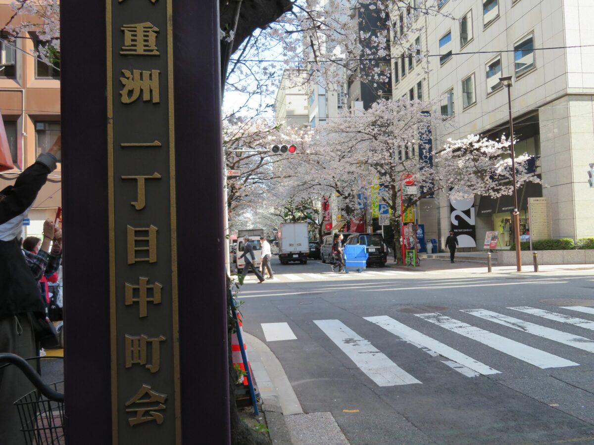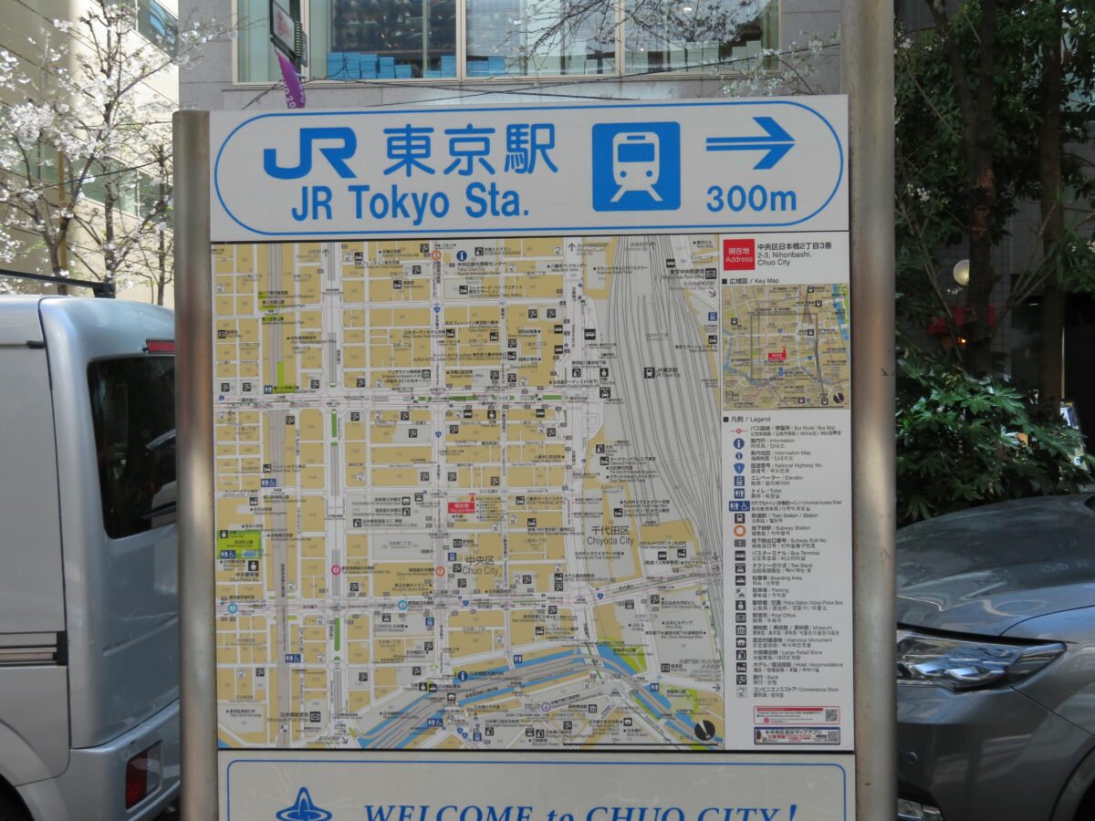 八重洲さくら通りは、八重洲1丁目から日本橋2丁目に向かいます。約500メートルの通り沿いには150本前後の桜が育ち、一斉に開花すると桜のトンネルに変身します。所どこに東京駅までの距離を掲示する案内板が設置されています。