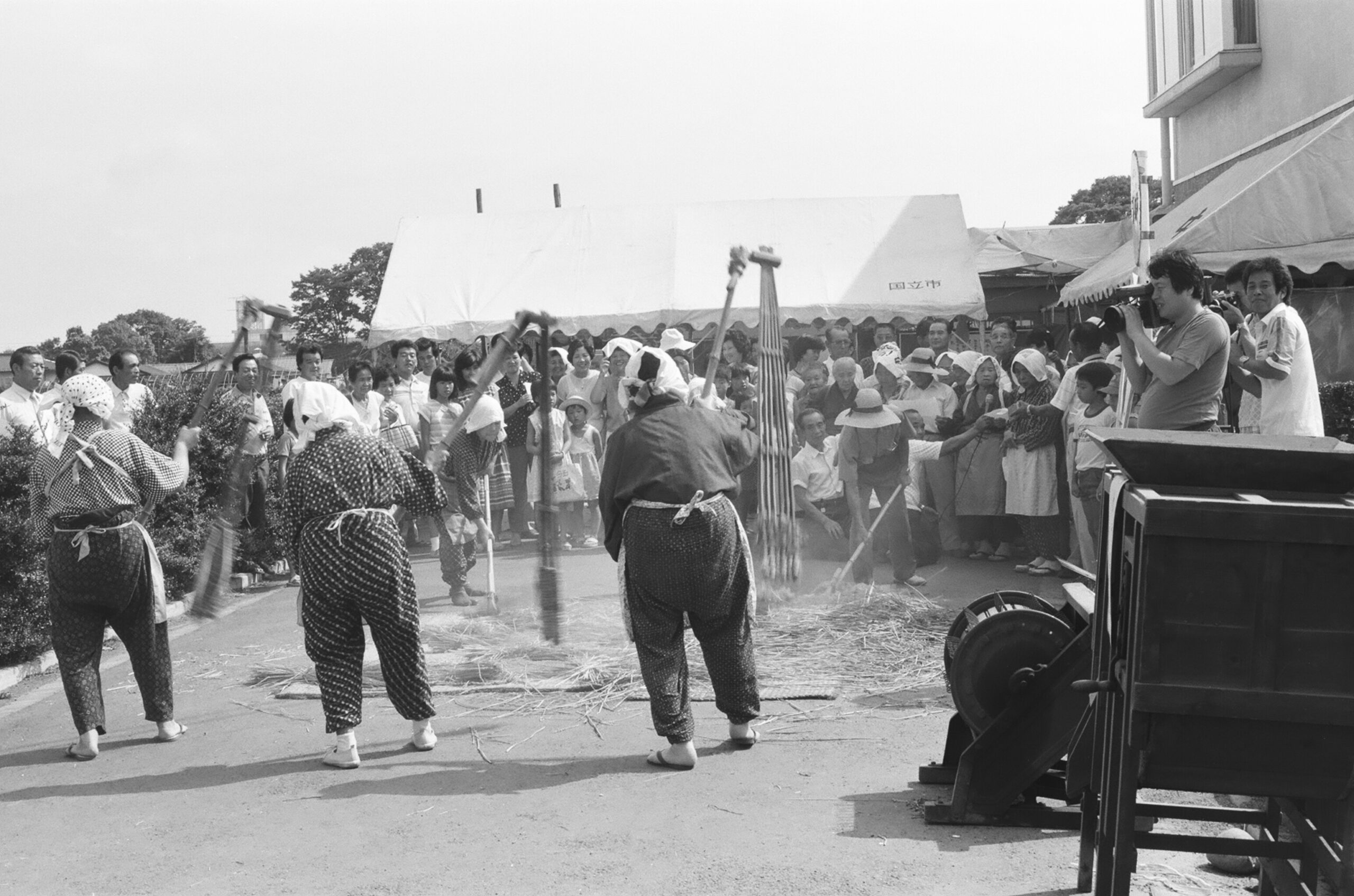 谷保の唄復興の機運は止まらず、1984(昭和59)年8月、谷保の中平地区で開催された地域の文化祭で、老人会による棒打ち歌の実演が行われました。若い頃に棒打ち作業を実際に体験した、あるいは作業を目にした世代の人々が、唄に合わせてくるり棒を振るいます。