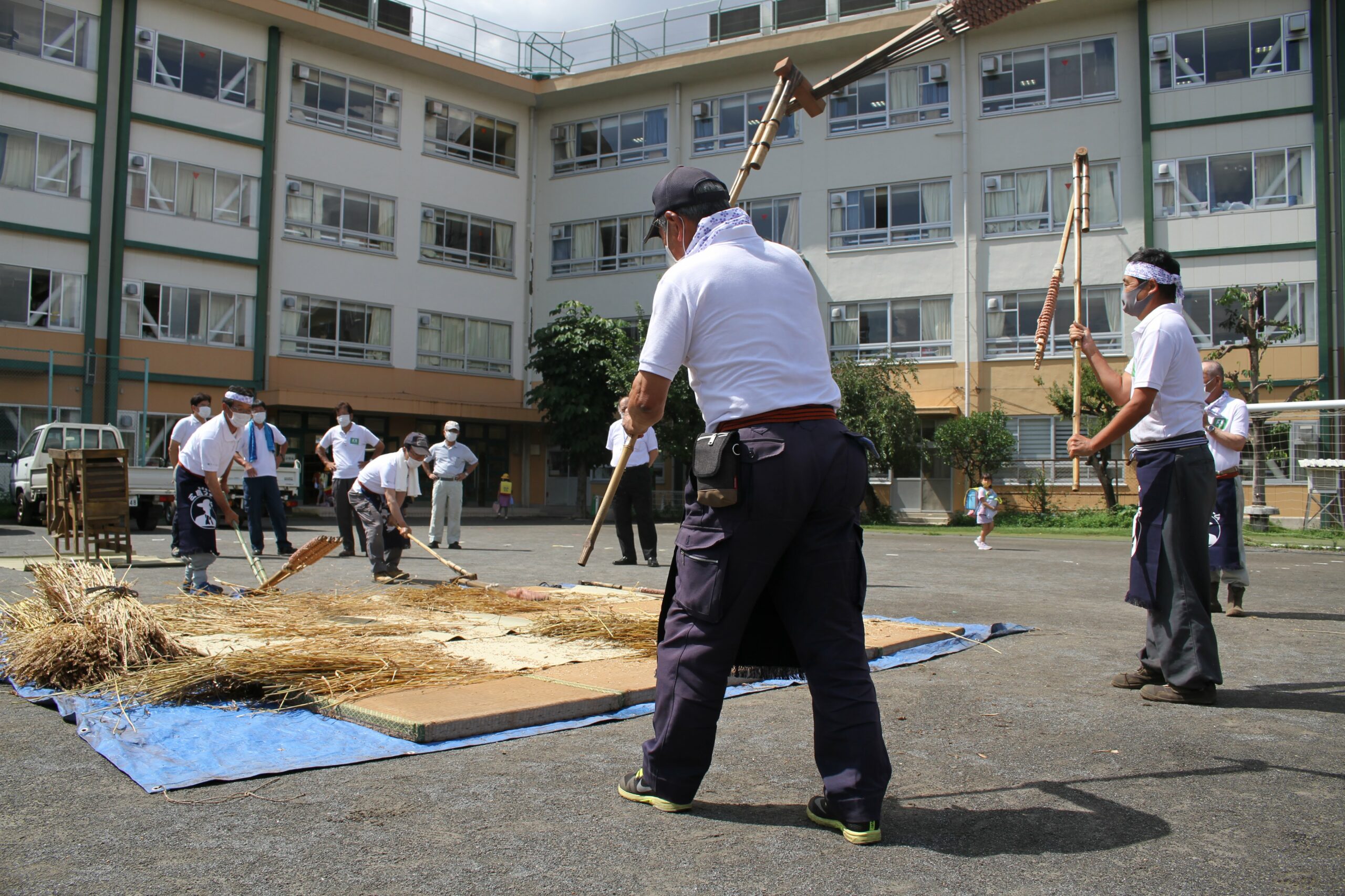 三鷹市の小学校で行われた麦打ち(棒打ち)の体験授業