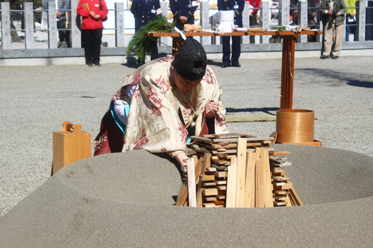 まずは宮司さんによる火伏です。杉の葉に、奥の桶で水を付けてしぶきを飛ばし火を消していきます!
