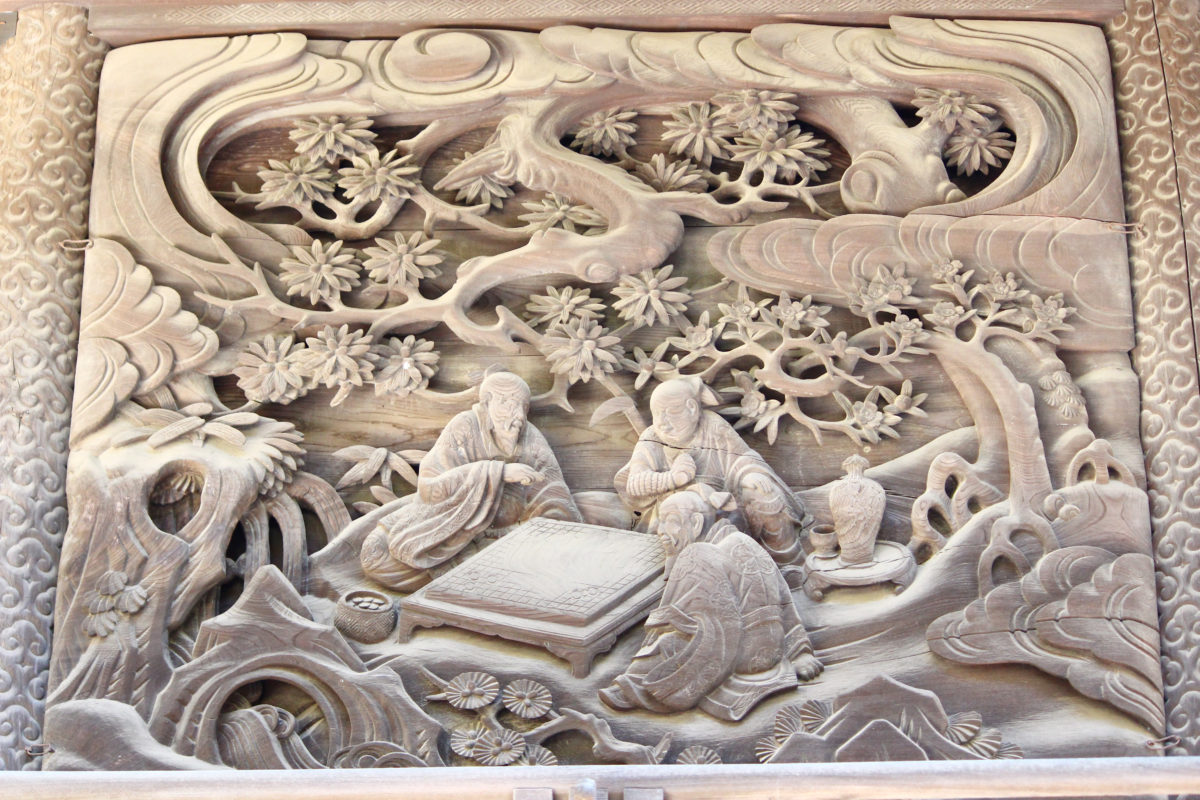 こちらは本殿裏にある大羽目彫刻「仙人の烏鷺(せんにん の うろ)」!烏鷺とは囲碁の別名で、仙人が囲碁に講じ、斧の柄が腐って折れるほど長い時間を過ごしてしまったと言う故事に因んだ彫り物だそうです。本当に見事な装飾ですね!ちなみに烏はカラス、鷺はサギを表し、その色から黒石と白石を連想して囲碁を表す言葉になっています。