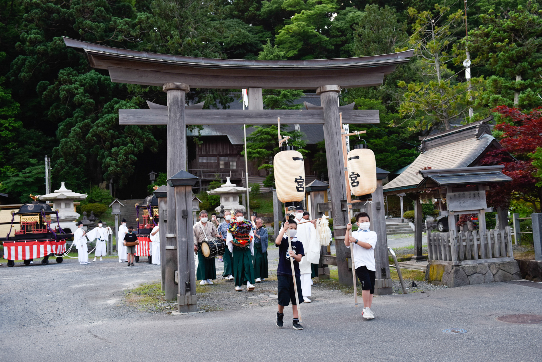 地域の方々が徐々に神社に集まり始めた。神輿が登場したのは、18:30過ぎだった。神輿は2つあり、大物忌神社とその隣の月山神社の神輿のようだ。それから行列ができ、高張提灯、神官、お頭様、太鼓、巫女、神輿などと順々に隊列が組まれて移動が始まった。道中、地域の家々の玄関前に高張提灯が灯され、夕暮れの道を照らしてくれてくれているのが印象的だった。普段であれば神輿は担ぐようだが、今回は新型コロナウイルスの影響を考え、台車により引いて歩く形をとっていた。
