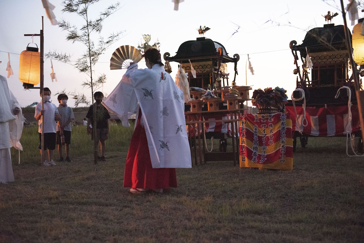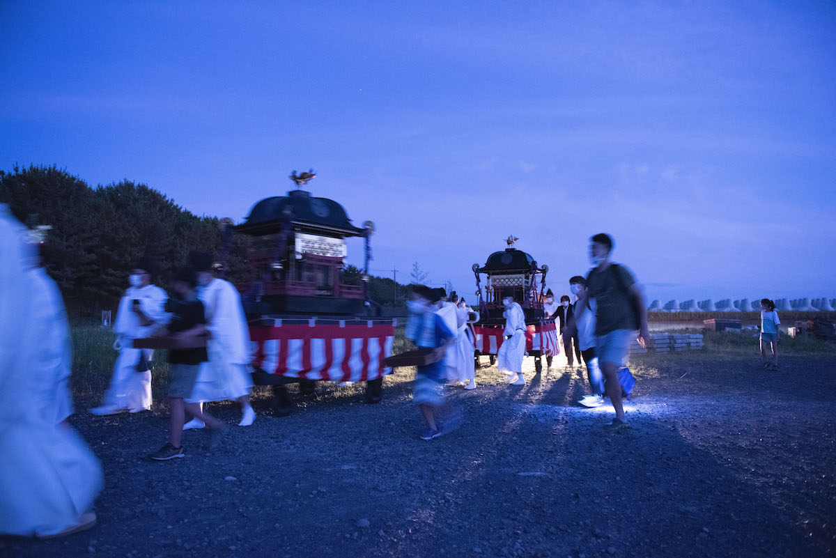 神事の流れとしては神輿をはじめとした行列が神社を出発し、町内を歩き西浜という海が見える場所にたどり着く。そこで結界を作り、獅子舞(お頭様)や巫女舞、玉串奉奠(たまぐしほうてん)などを実施する。その後、神社に戻るというのが一連の流れだ。それでは、実際に神事を拝見した様子を振り返っていきたい。