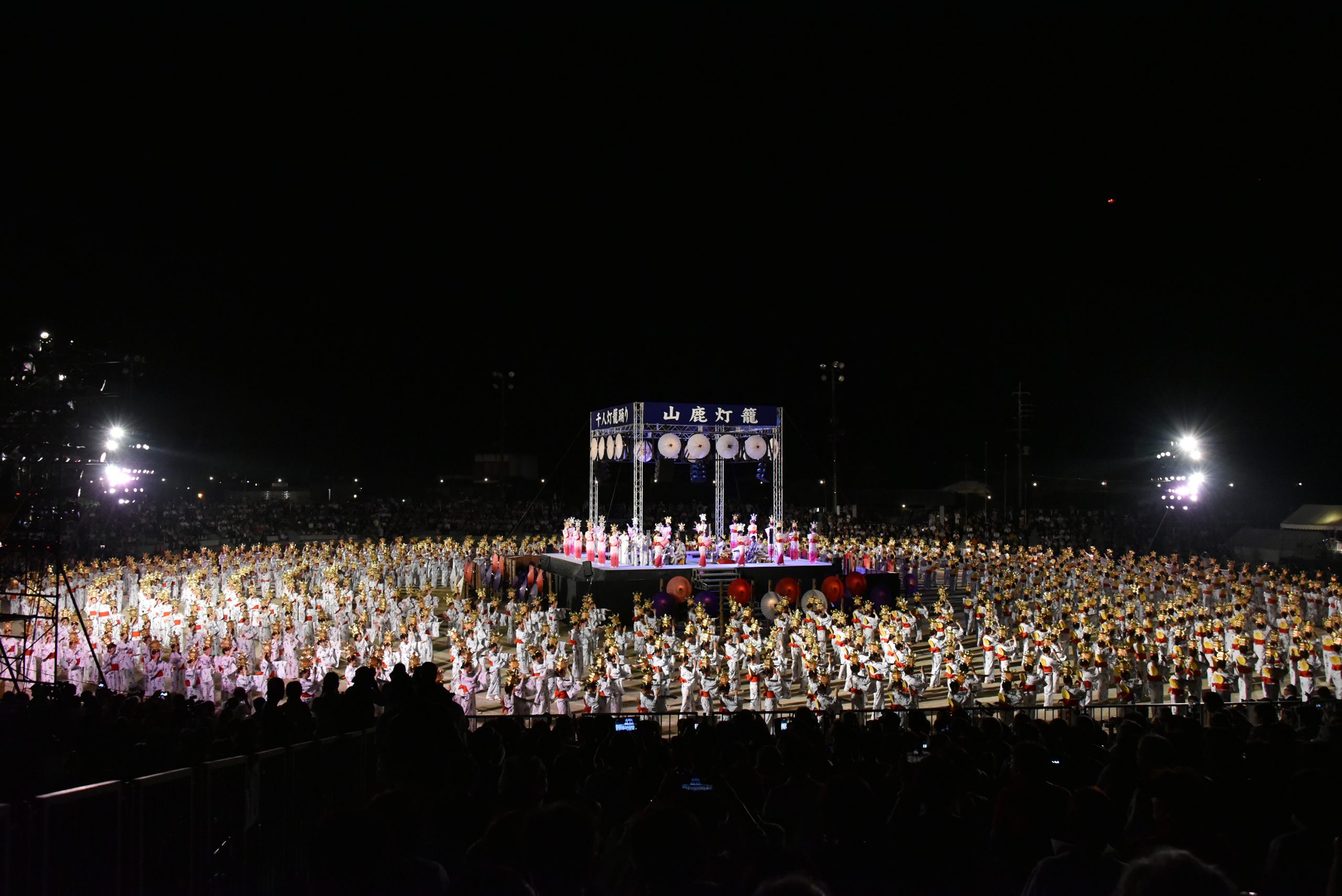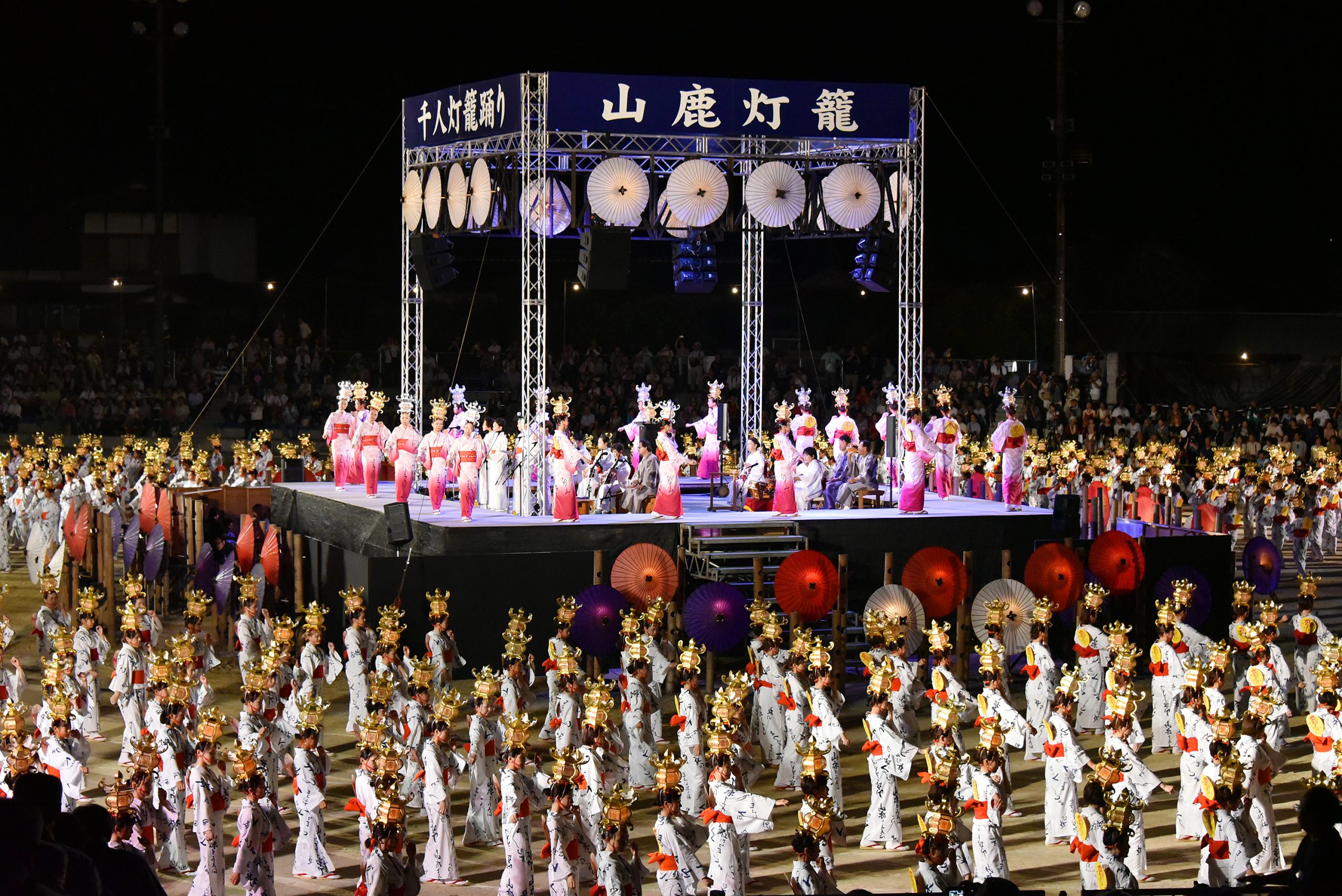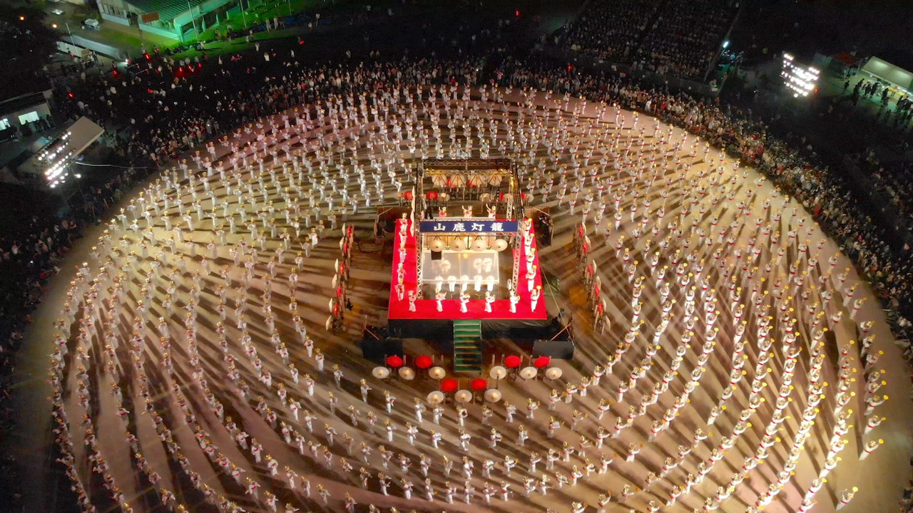 そのほか、演芸や郷土芸能のステージ、エンタメショーやグルメフェス、初日の夜に菊池川を華やかに彩る4000発の花火など盛りだくさんですが、何といっても最大の見どころは2日目の夜に山鹿小学校グラウンドで行われる優美にして迫力のある「千人灯籠踊り」です。