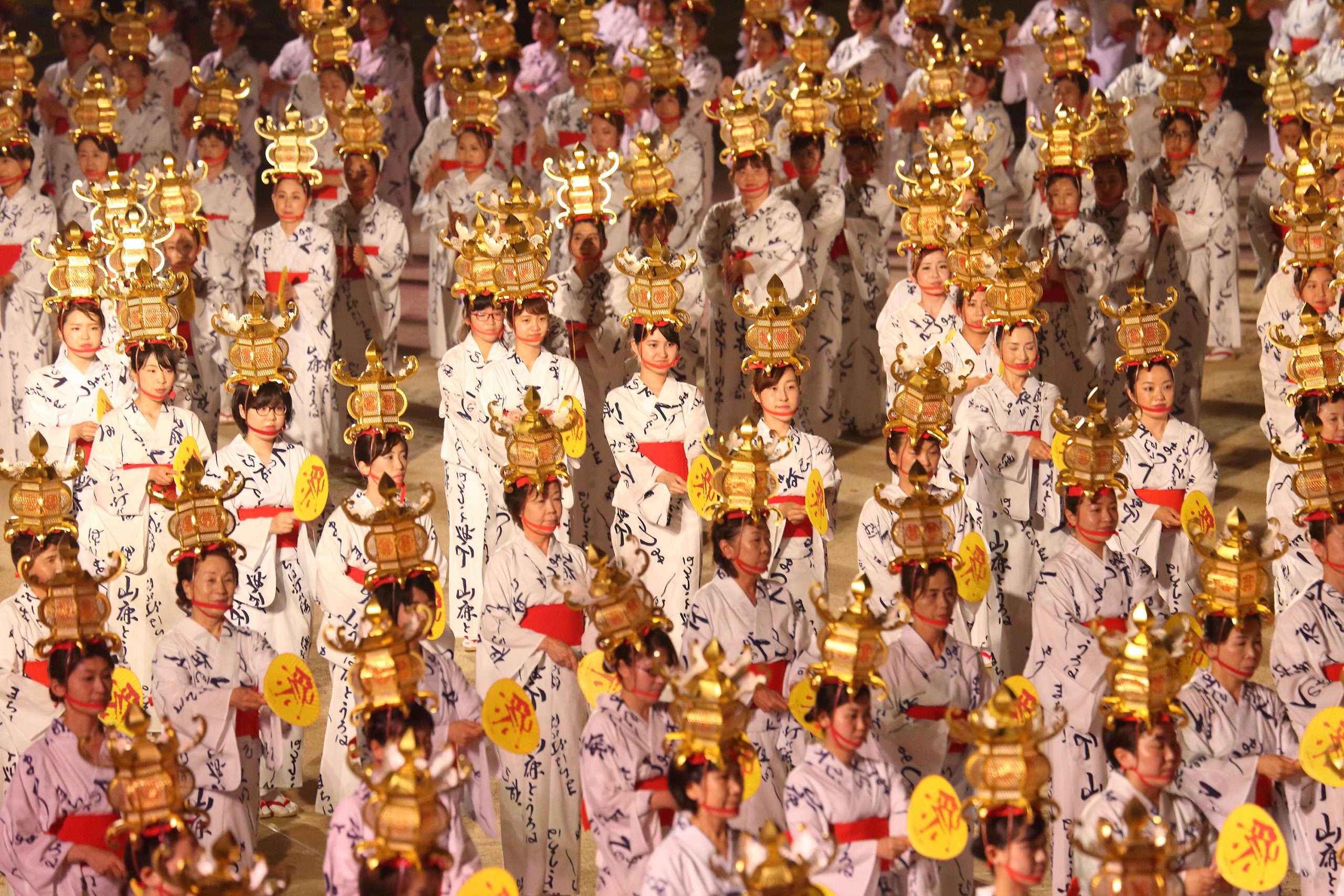 やぐらを中心に1000人の踊り手が幾重もの周円をつくり、踊りにあわせて金灯籠の灯りがゆらりゆらりと揺れたり、周ったりする光景は、光と幻想の世界に迷い込んだような陶酔感をもたらしてくれるでしょう。