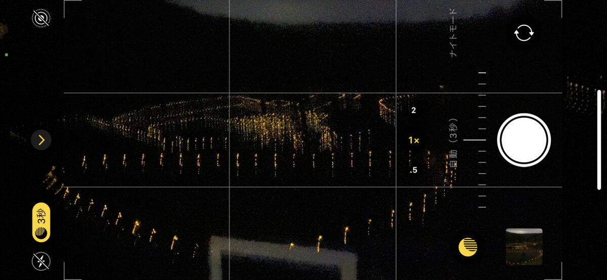 こちらは一例ですが、iPhoneでも一部の機種は「ナイトモード」に対応し3秒や10秒で撮影ができます。多くの光を取り込み、いい感じの写真が撮れるのでぜひやってみてください。