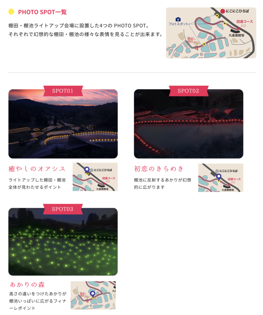 棚田・棚池それぞれをライトアップしているイベントは全国にありますが、棚田・棚池両方をまとめてライトアップしている箇所は全国でもココだけ、とのことです。