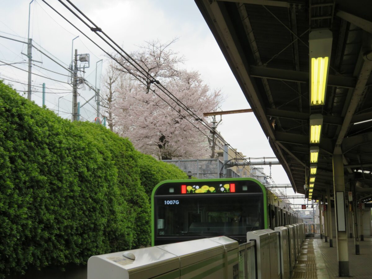 桜の並木道を徒歩で散策するのもいいですが、電車の窓越しに流れる桜並木には異なった味わいがあります。巣鴨駅には桜の花の下を黄緑色の山手線が入線してきます。