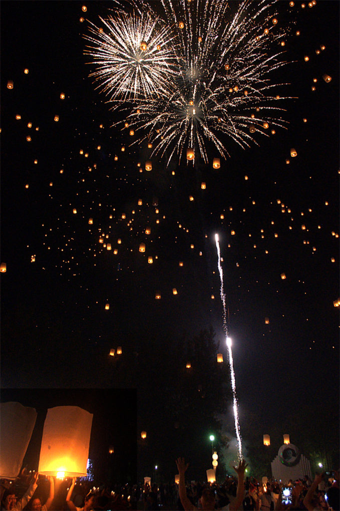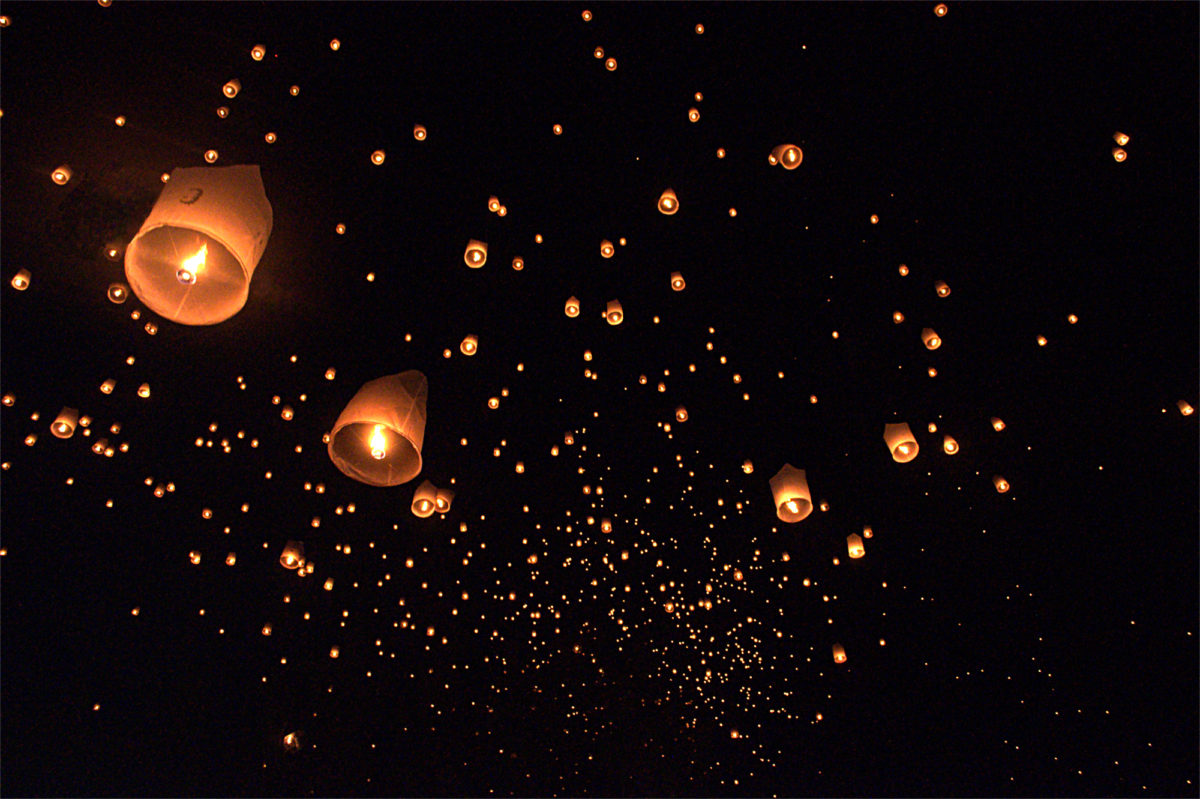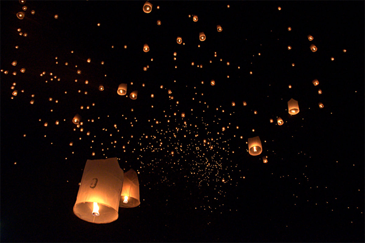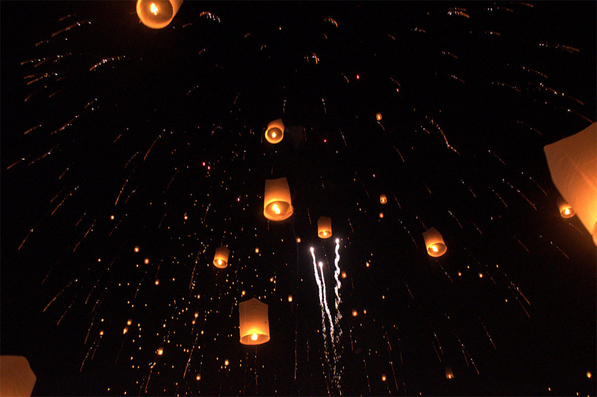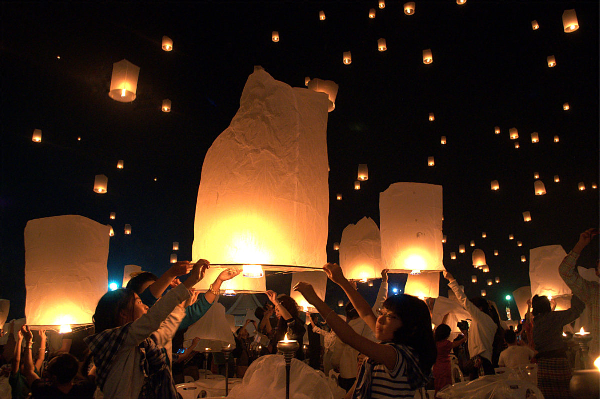 元々タイの伝統行事で、陰暦12月の満月の夜にロイクラトンという、灯篭を流し祈りを捧げる仏教のお祭りお祭りが開かれています。タイの北部 チェンマイでは、灯篭を水に流す行事に加え、灯篭(ランタン)を空に打ち上げる「コムローイ」という行事が行われていました。