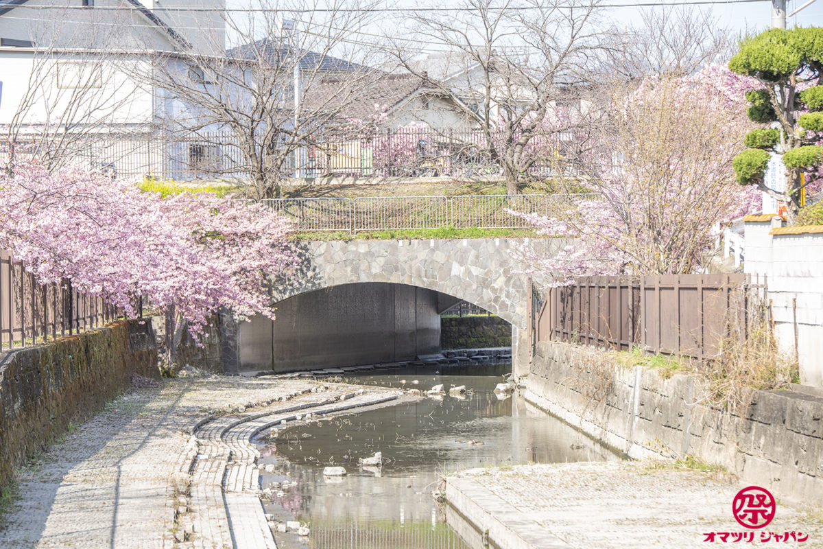 京阪淀駅の四番出口を右方向に高架下をピンク色の河津桜の旗を目印に5〜10分歩くと淀水路に到着。
