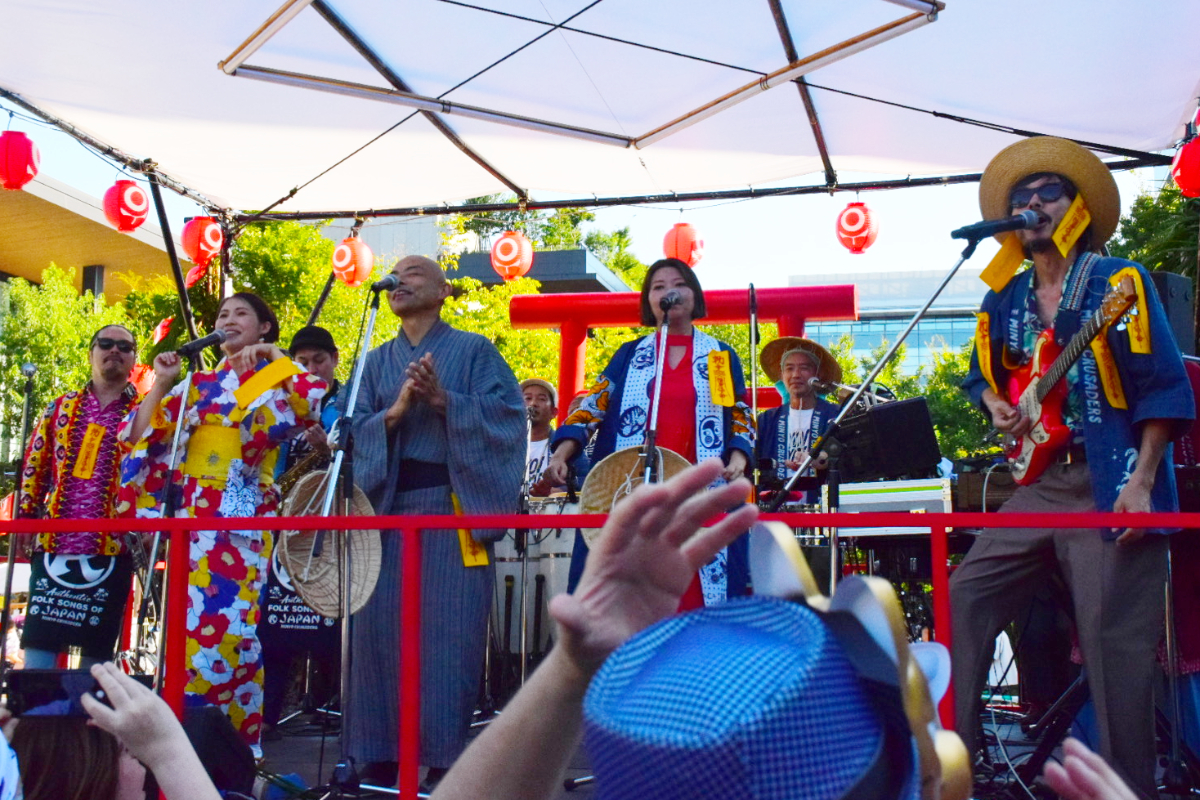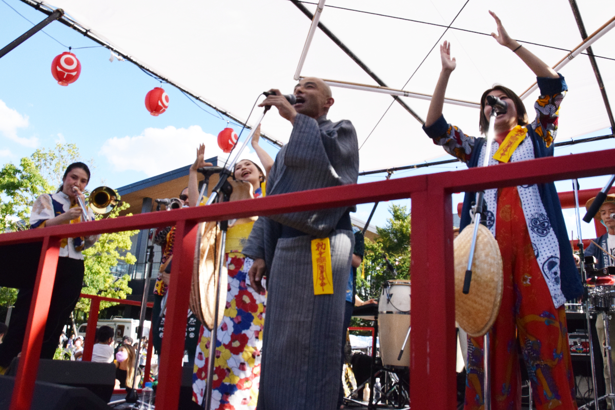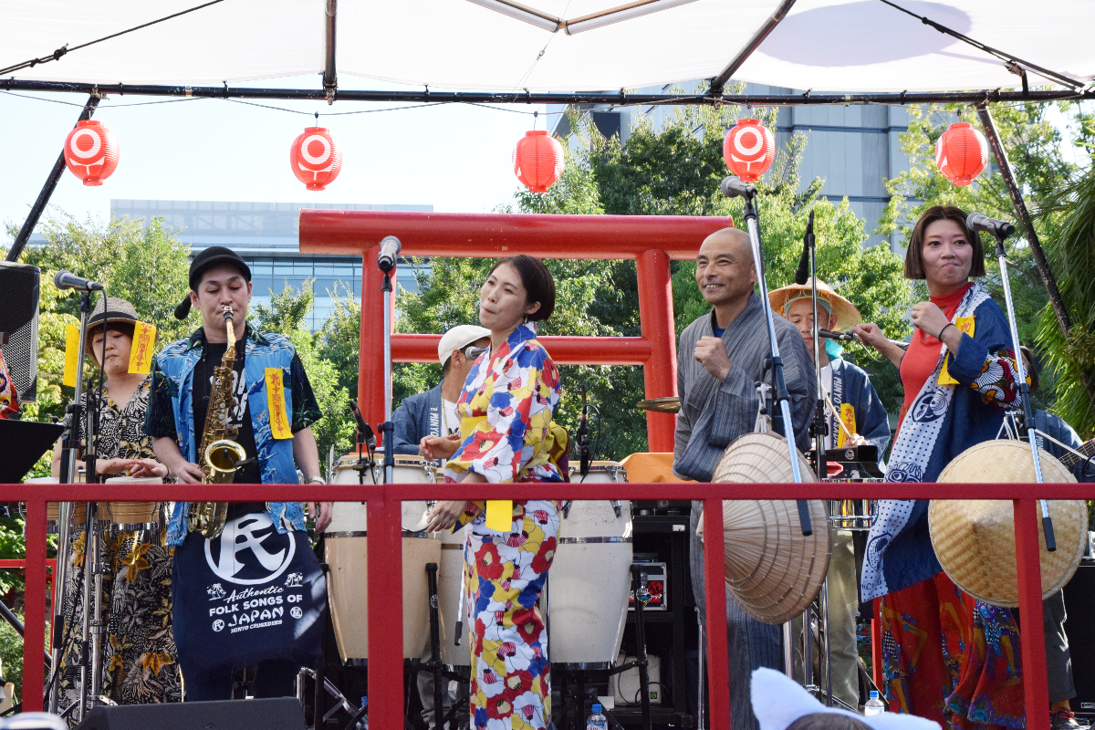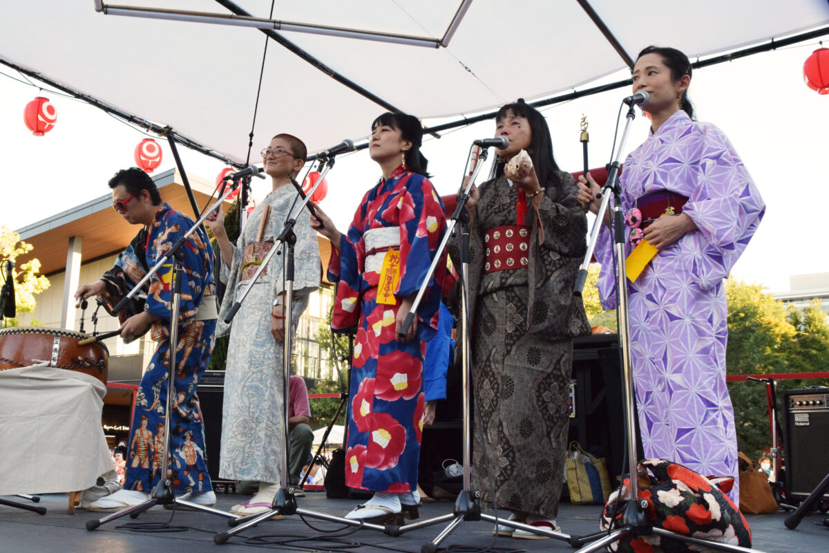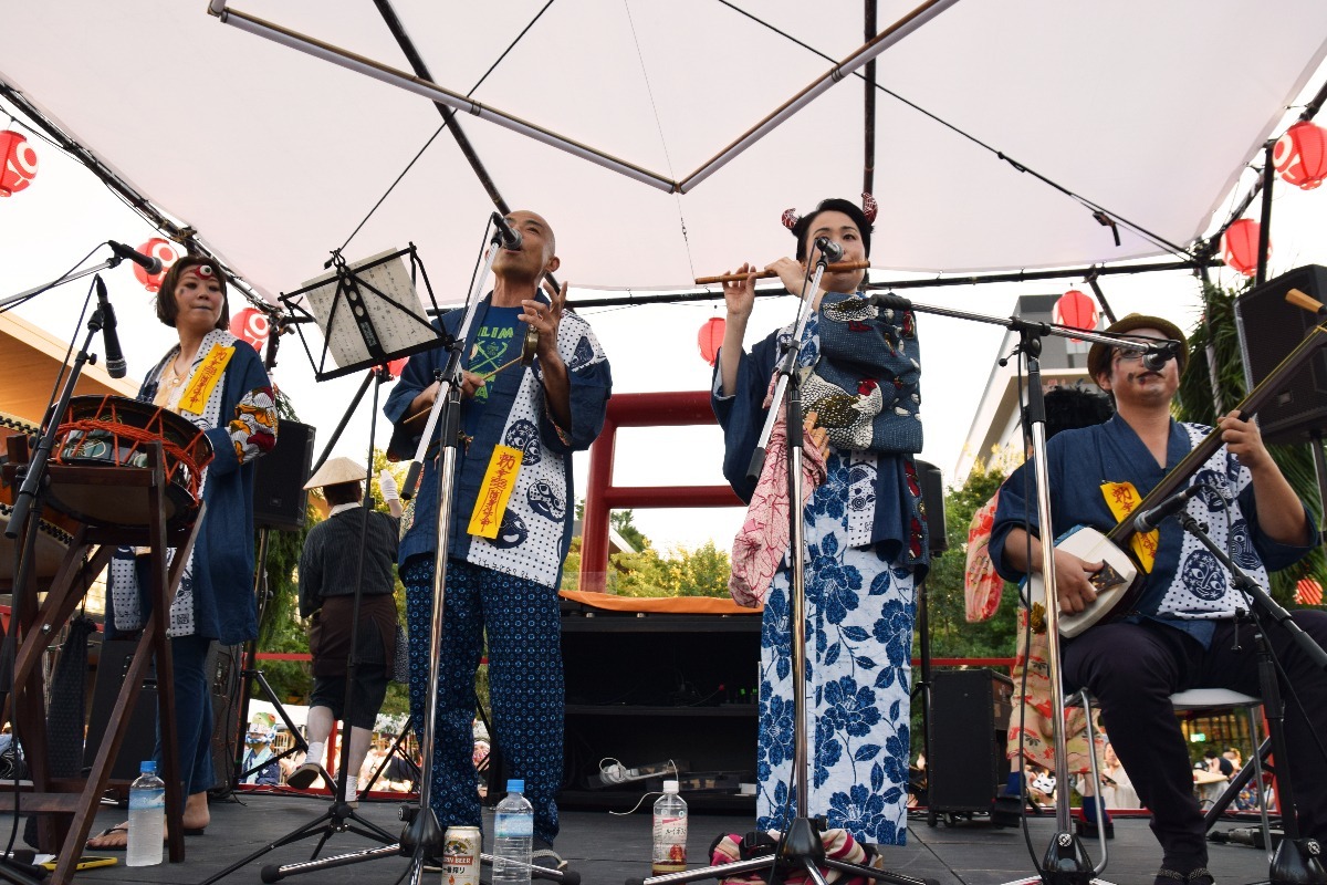 太陽もだいぶ西に傾いた頃、ステージに登場したのは、民謡クルセイダーズでもボーカルを務めるフレディ塚本さんが所属する4人組の民謡ユニット「こでらんに~」の皆さん。