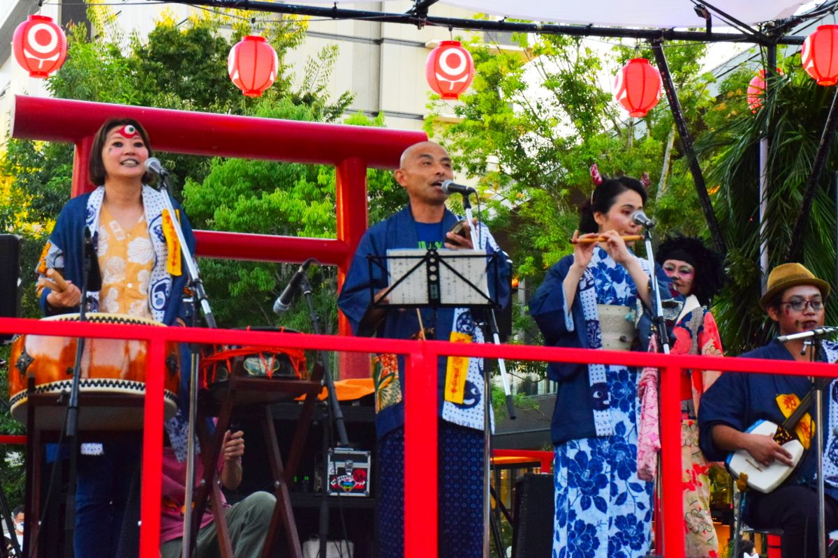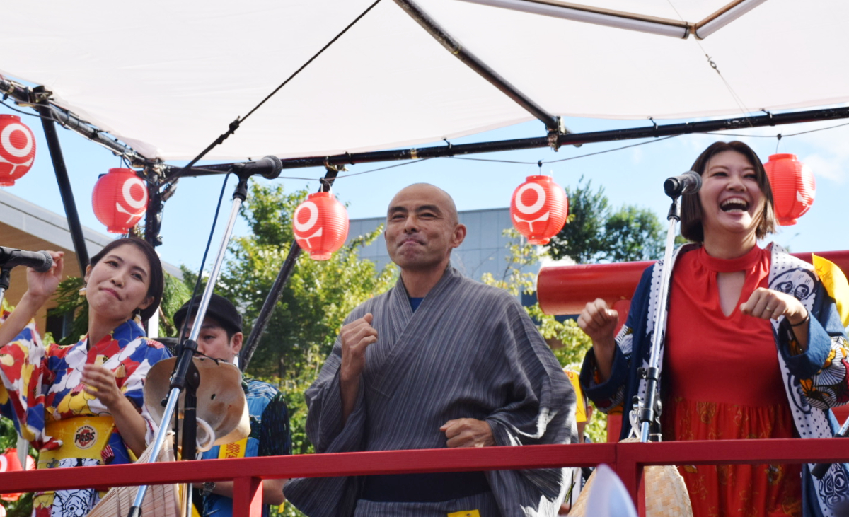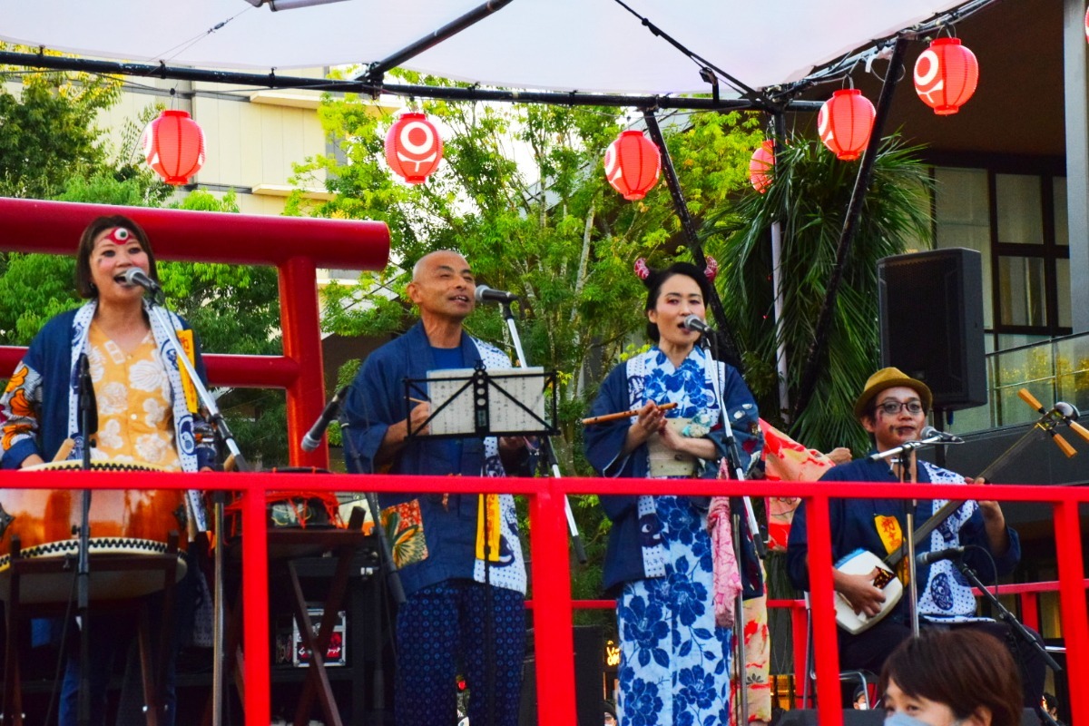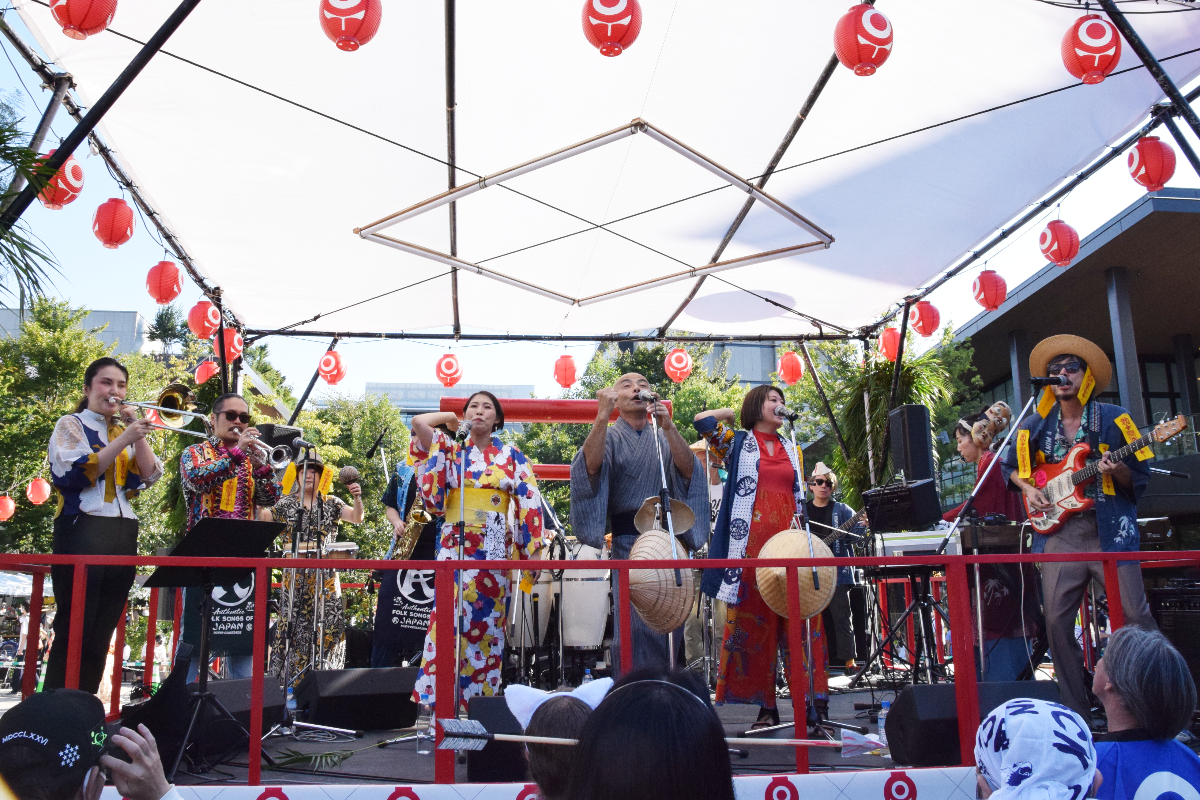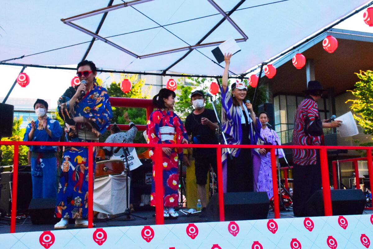 太陽もだいぶ西に傾いた頃、ステージに登場したのは、民謡クルセイダーズでもボーカルを務めるフレディ塚本さんが所属する4人組の民謡ユニット「こでらんに~」の皆さん。