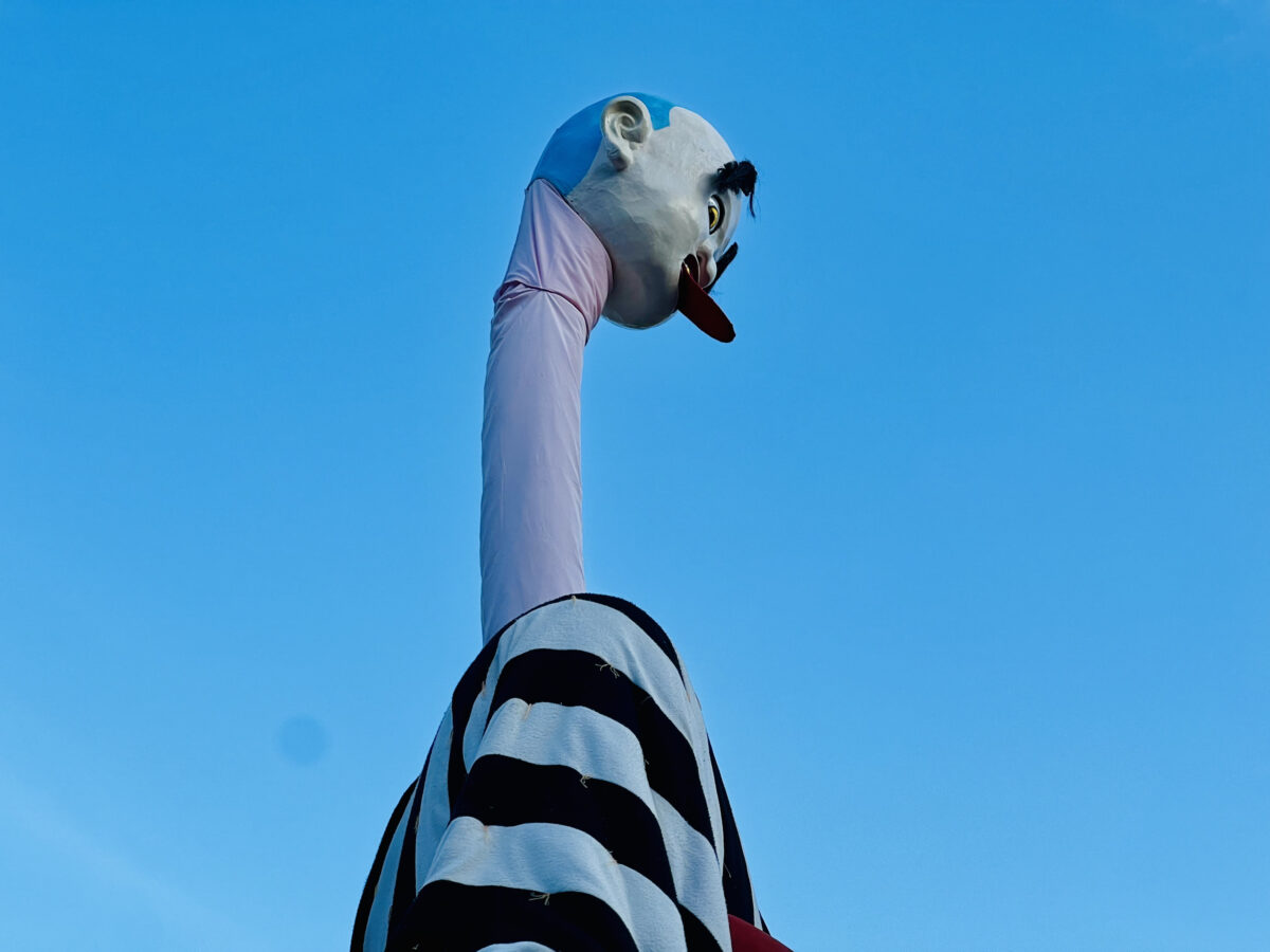 アーケードを抜けたところの広場前で、首を伸ばす演技を披露。首が伸びるだけでなく白目を向いたり、舌を出して人間を小馬鹿にする(!?)ギミックまで仕込まれています。キテレツかっ!