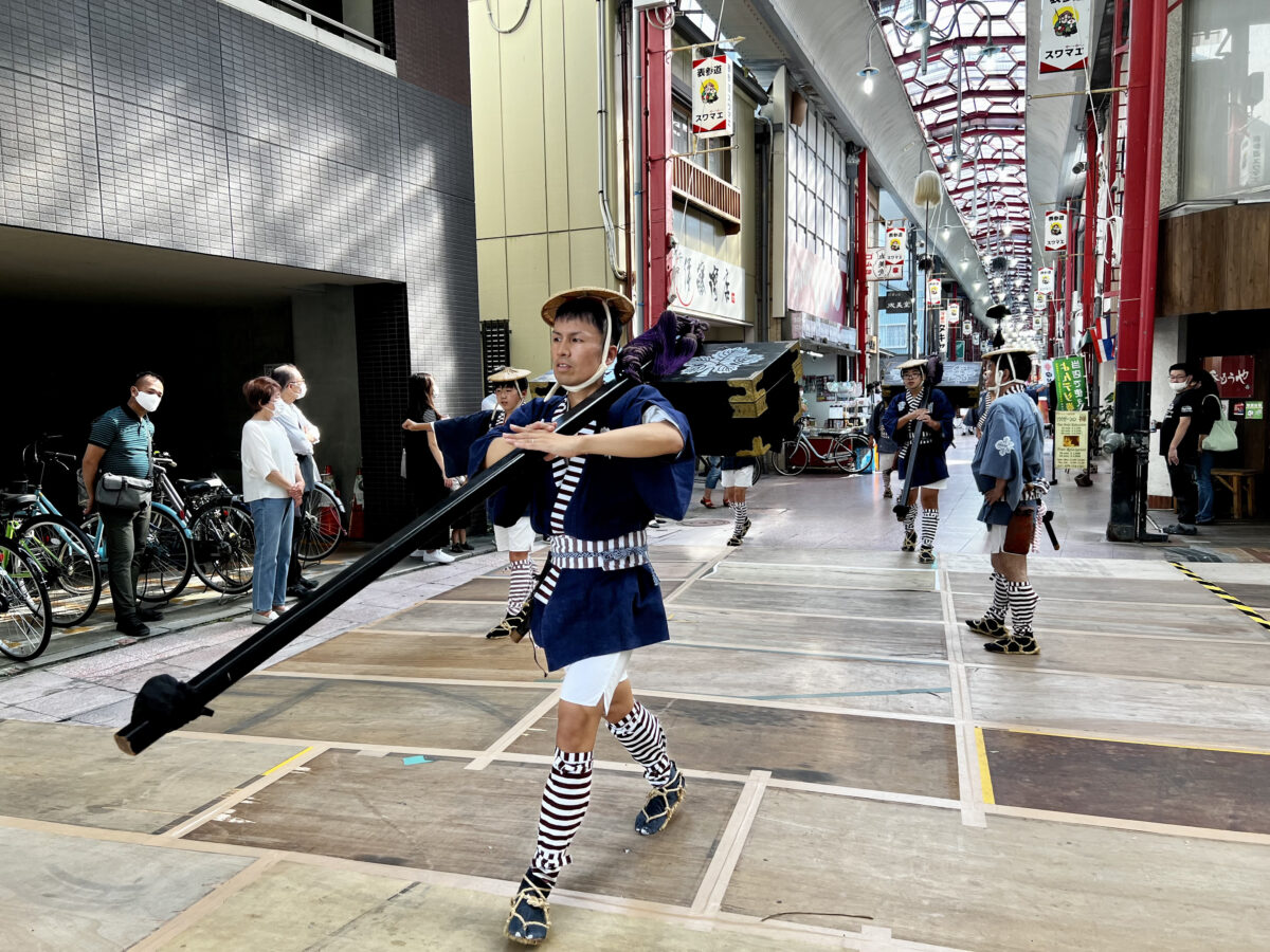 商店街のアーケードに突如、時代行列が出現!「ヒーサーヒー」の掛け声とともに、奴が道具類を投げ渡すところが見所です。ただテクテク歩いているだけではないのです。