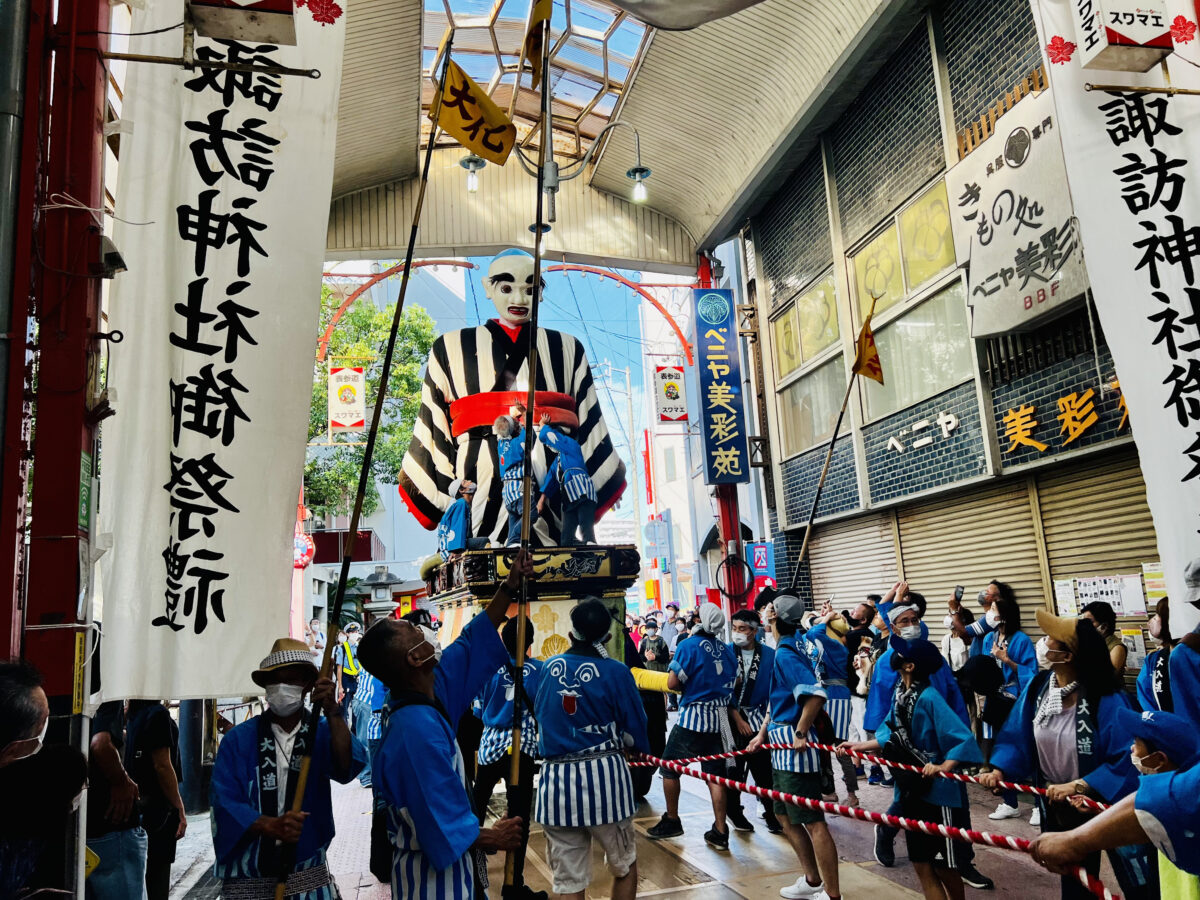 これらの山車は、毎年秋に行われる諏訪大社の例大祭「四日市祭」でも登場します。ここからは、昨年2022年10月の四日市祭の現地レポートをお届けしますので、特に大入道のからくり山車にご注目を!そして、最後にお知らせする2023年夏の「大四日市まつり」開催情報とあわせ、ぜひお出かけの参考にしてください。