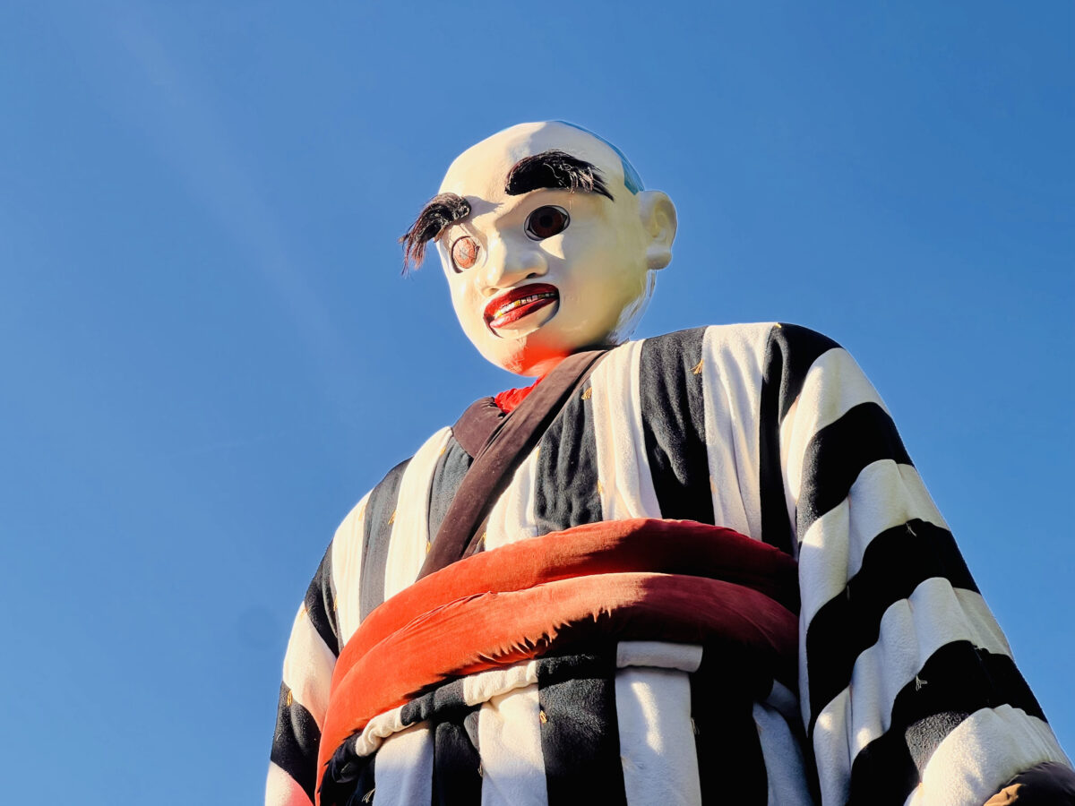 2日目は歴史を感じる大名行列、獅子舞や諏訪太鼓といった伝統芸能の披露に加え、四日市の文化財でもあるからくり人形などの作りものを乗せた山車(だし)の数々が練り歩きます。なかでも、四日市市のマスコットキャラクター「こにゅうどうくん」の“お父さん”でもある「大入道」の迫力と精巧な動きは必見です。