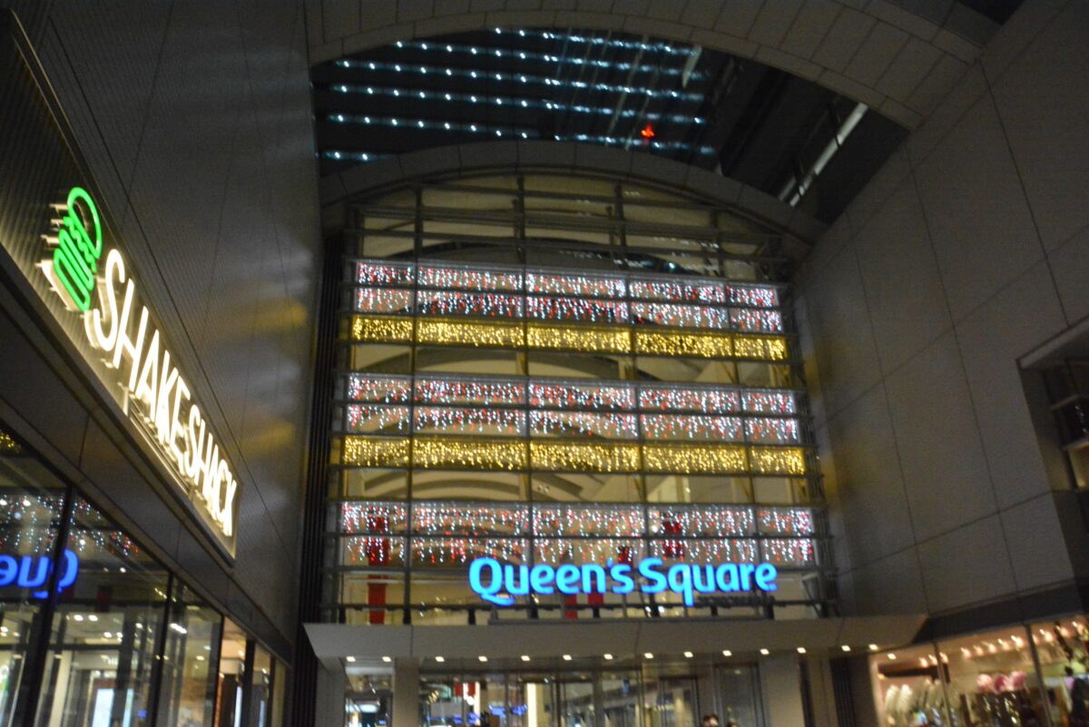 グランモール公園の南のランドマークプラザから入るクイーンズスクエアには、クリスマスのムードが溢れています。中央に飾られる「ワン・ワールド・ツリー」では1日6回、パイプオルガンの響きに合わせたイルミネーション・ショーが行われています。