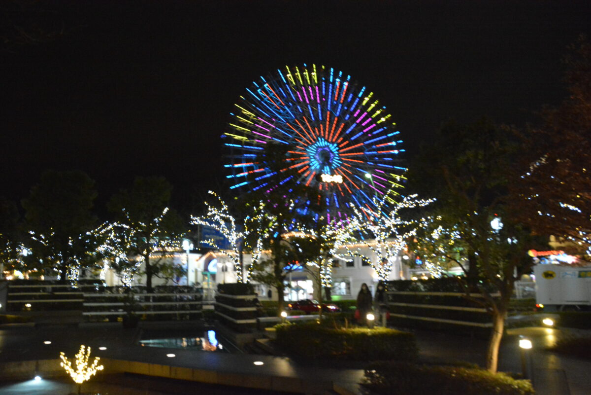 眩しい光を放ちながら回転する「よこはまコスモワールド」の観覧車