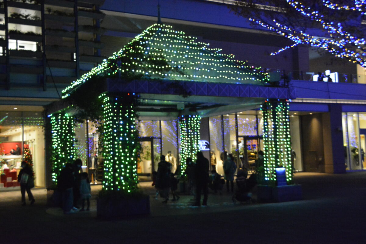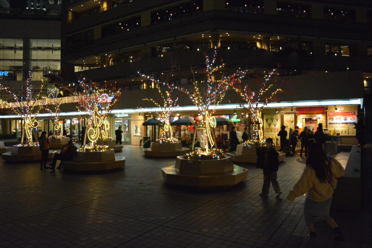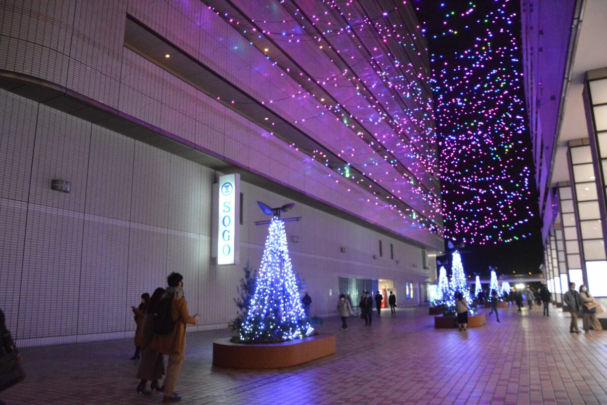 グランモール公園から北に繋がるグランモールの「桟橋の広場」、「眺めの広場」は、イルミネーションの並木道です。「桟橋の広場」が接するMMテラスの館内にもクリスマスツリーが設置されています。