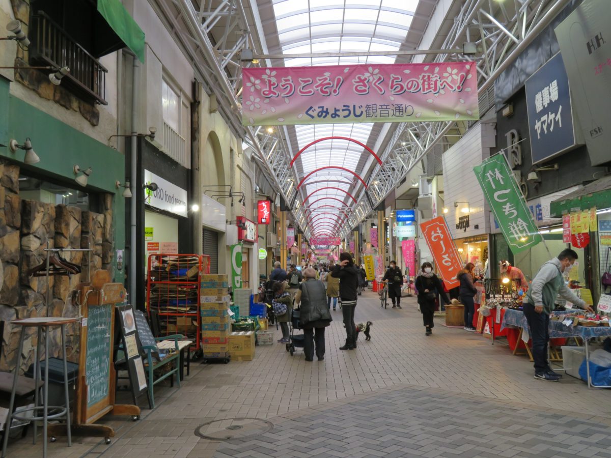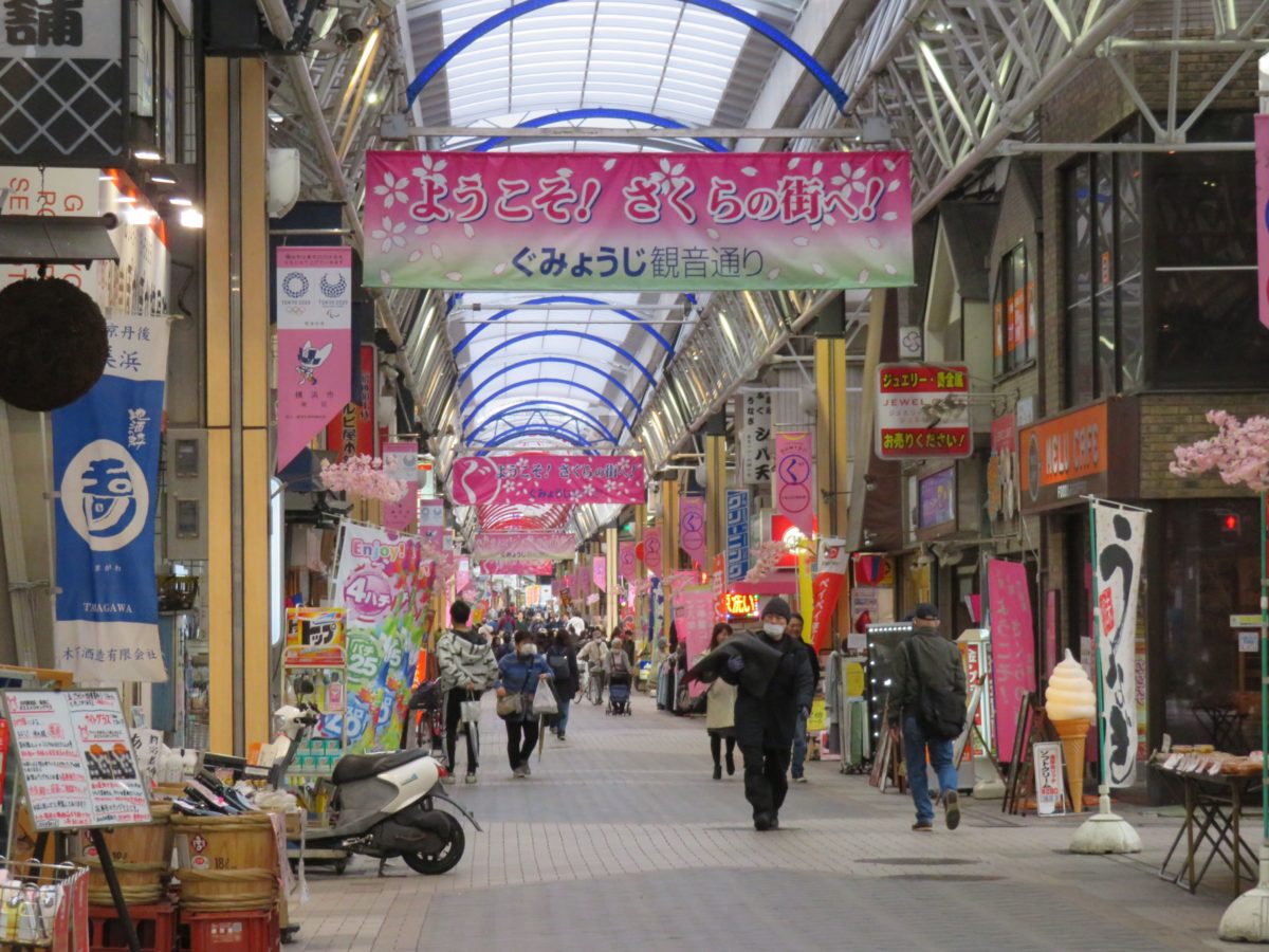 「大岡川プロムナード」は、京急線弘明寺駅近くの観音橋から、京急線黄金町駅近くの太田橋まで約3.6キロ続く桜並木です。弘明寺駅の東に伽藍を構える弘明寺と大岡川に架かる観音橋を繋ぐのは、弘明寺観音通りです。アーケードを備えた商店街には世代を越えて営業を続ける商店が数多く並んでいます。