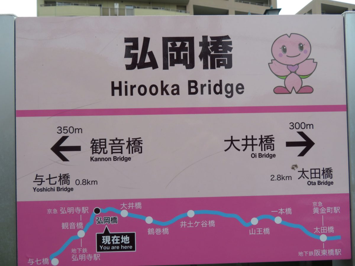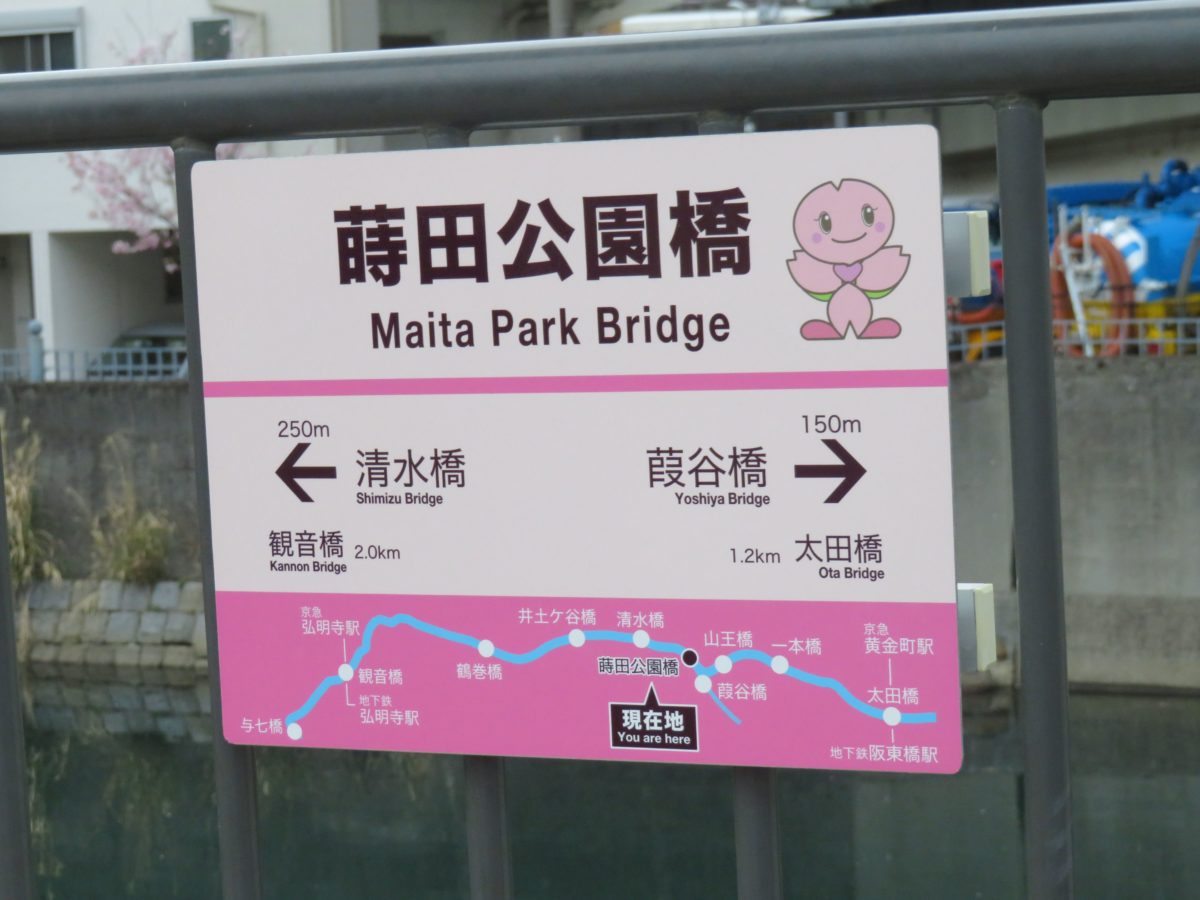 観音橋から「大岡川プロムナード」を歩き始めると、弘岡橋、大井橋、鶴巻橋、蒔田橋、井土ケ谷橋、清水橋、蒔田公園橋、葭谷橋、山王橋、一本橋、道慶橋、白金人道橋、栄橋を経由して、太田橋に至ります。全ての橋の袂には前後の橋までの距離が表示されるパネルが設置されているので、現在地の確認ができる上に、残りの距離を正確に把握することができます。