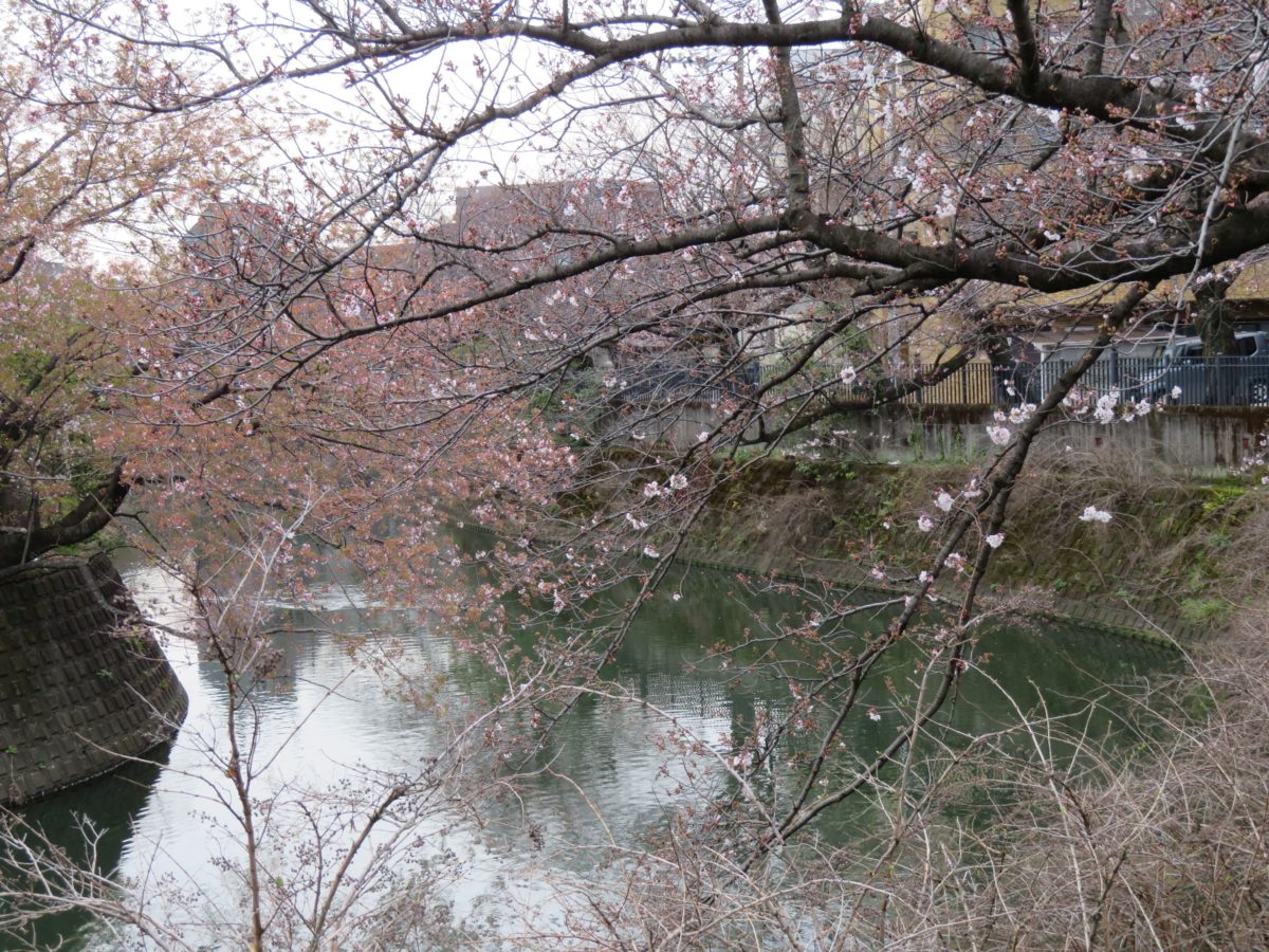 大岡川の川面に向かって伸びる桜の枝