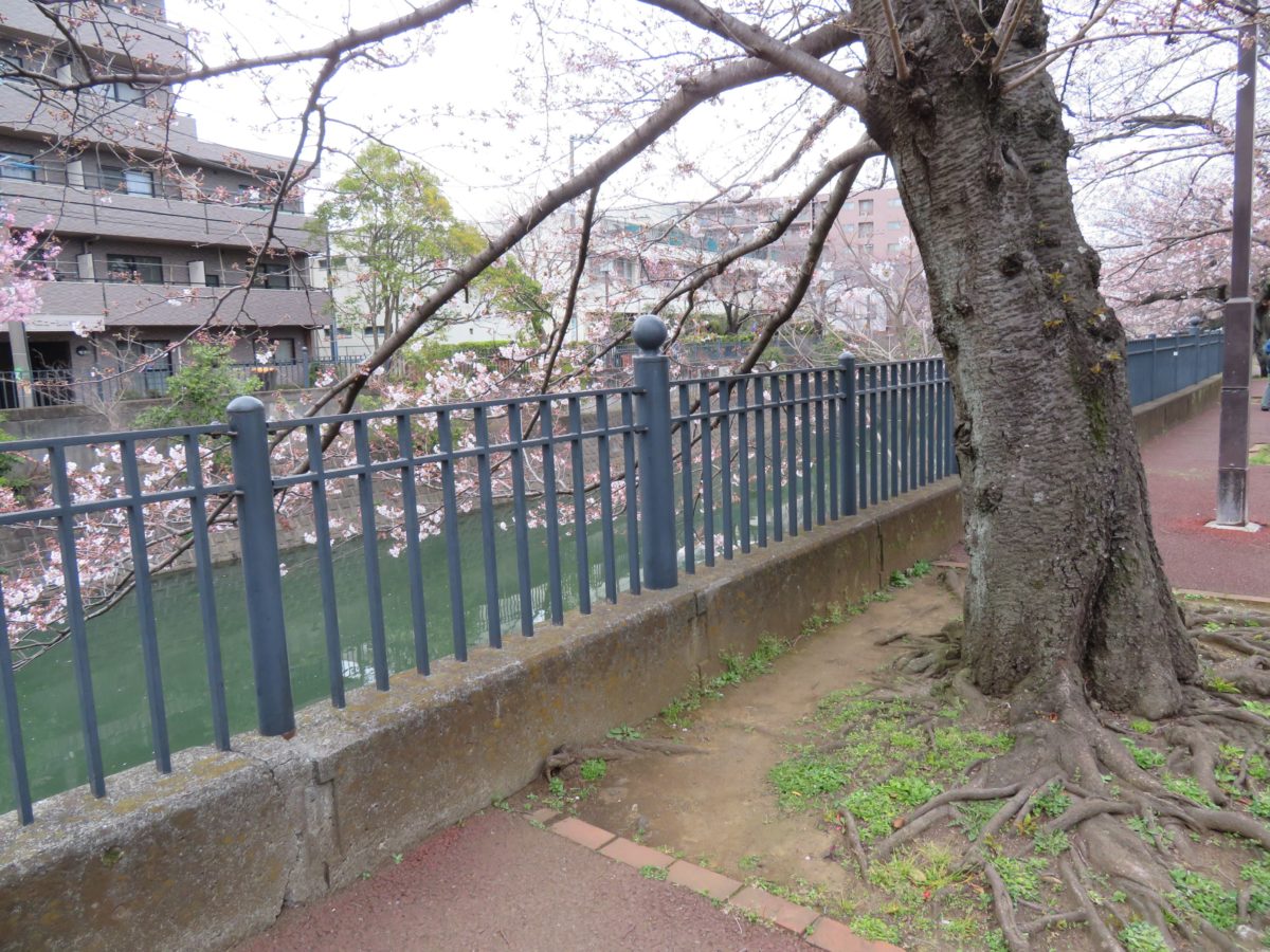 弘岡橋の付近でも桜の並木は途絶えません。大岡川沿いに育つ桜の特徴は、枝が上は横に伸びるばかりでなく、下方にも向かっているのです。中には根より下に伸び、大岡川の川面を目指しているかのようです。