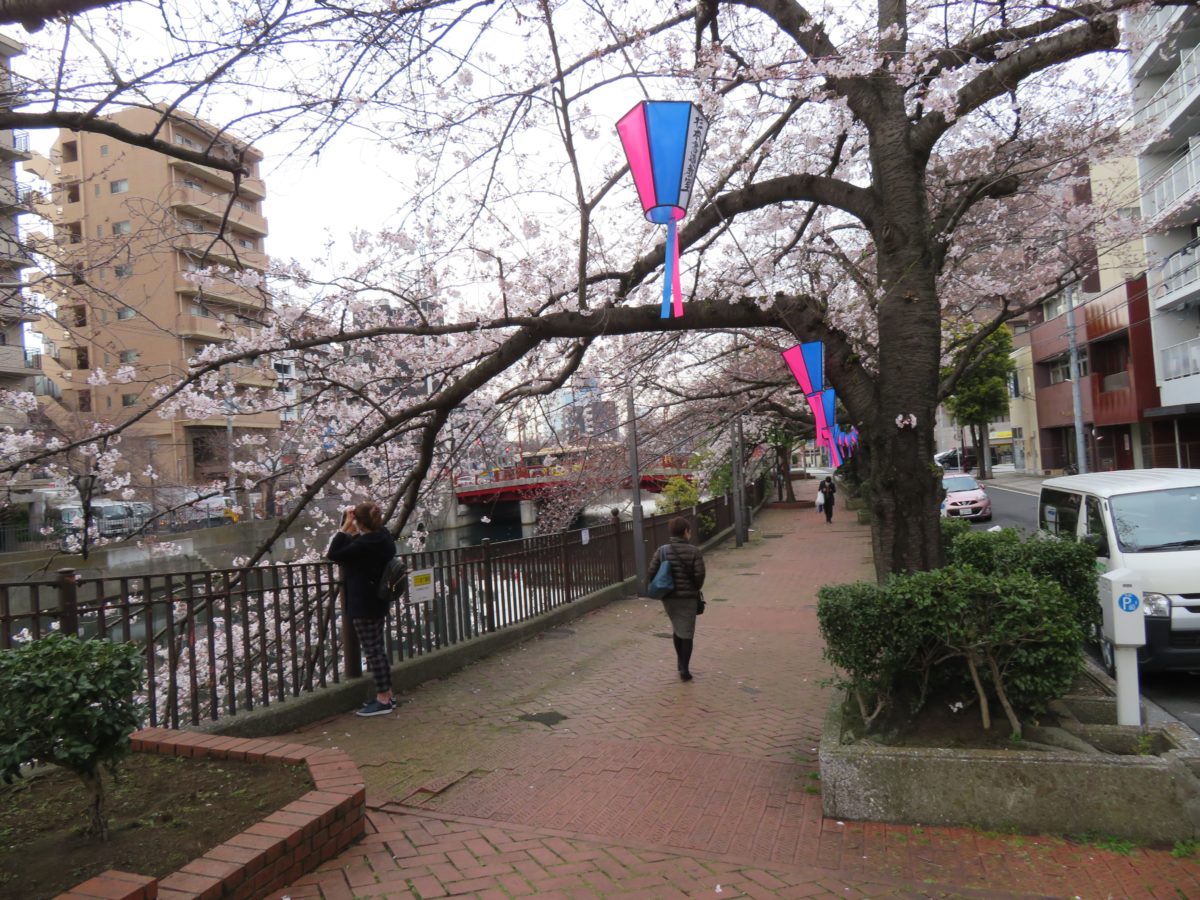 白金人道橋からは栄橋を挟んで太田橋まで、桜並木にはぼんぼりが吊るされています。