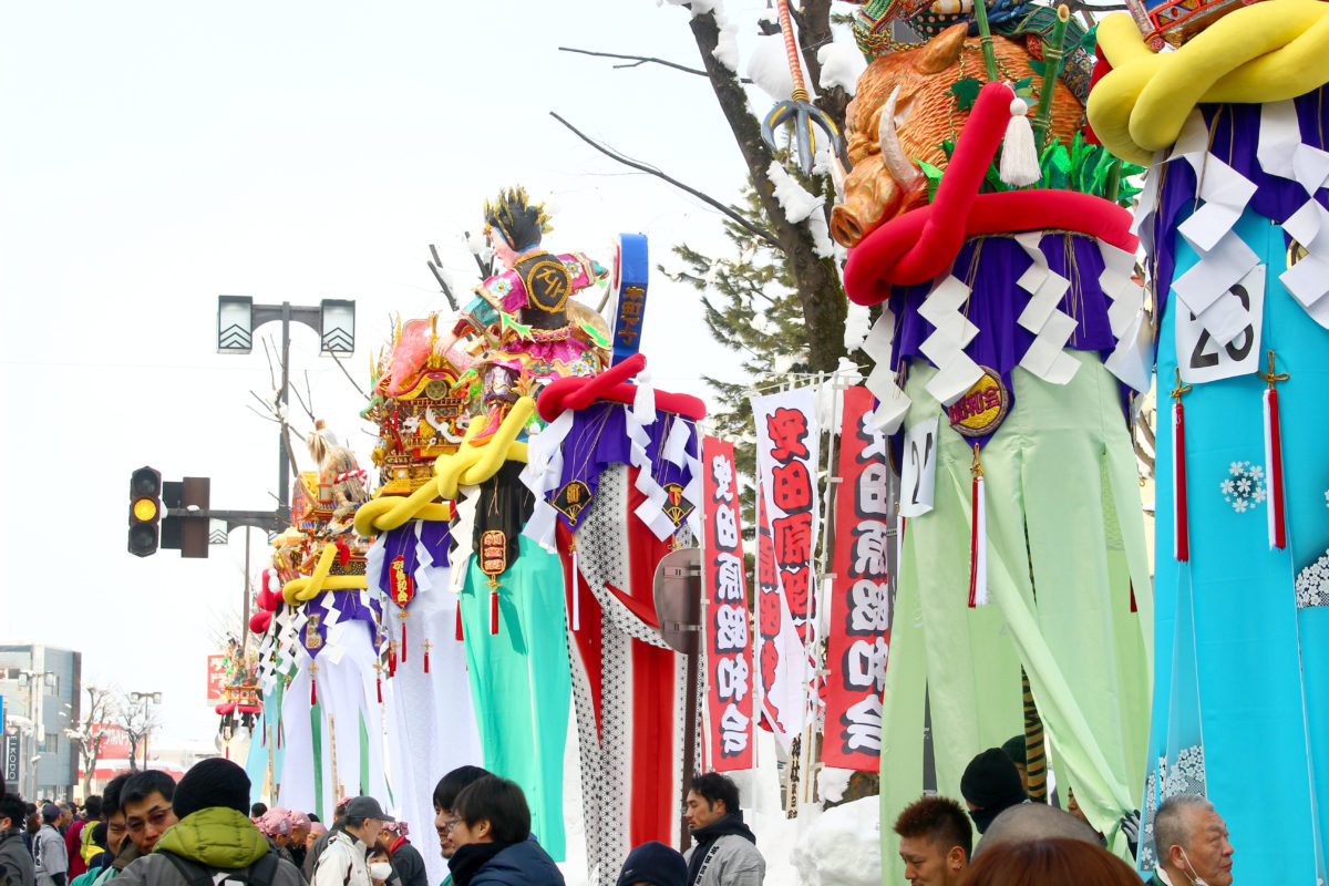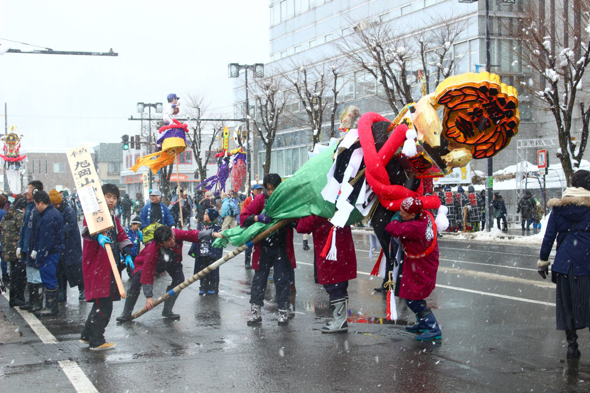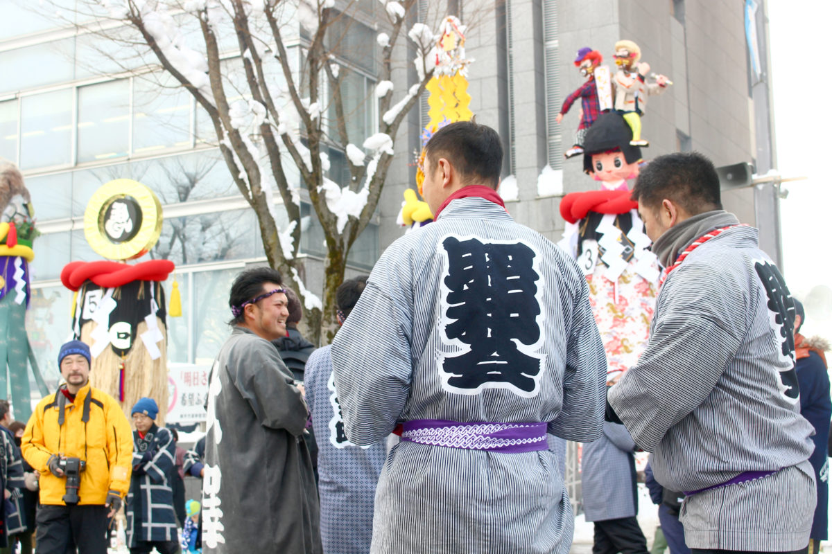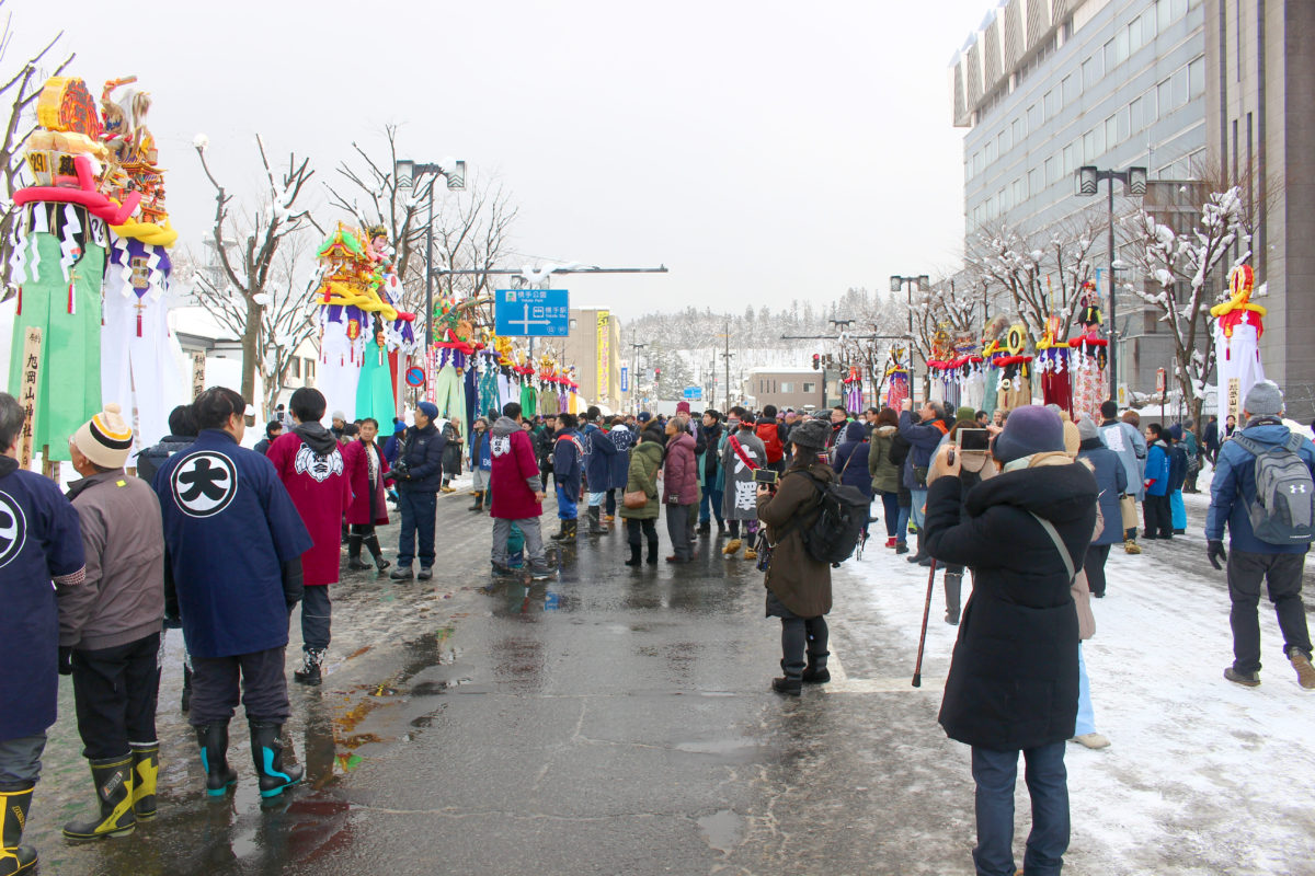 ぼんでんコンクールの表彰が終わると、ぼんでんは各地に帰っていきます。翌日の「旭岡山神社梵天奉納祭」では、朝10時にまたこちらに集合し、3時間かけて旭岡山神社まで練り歩きます。今日とは打って変わって、荒々しさが目立つ二日目の横手のぼんでんも注目です!