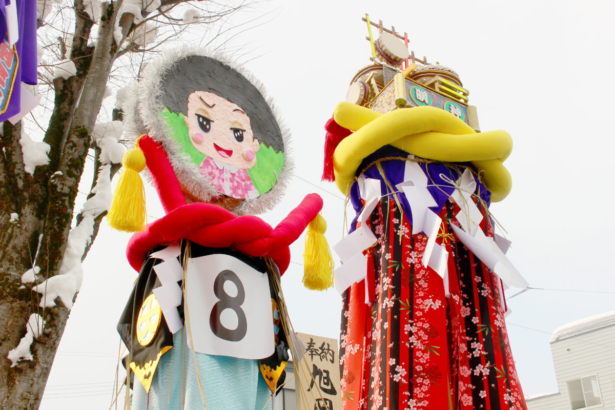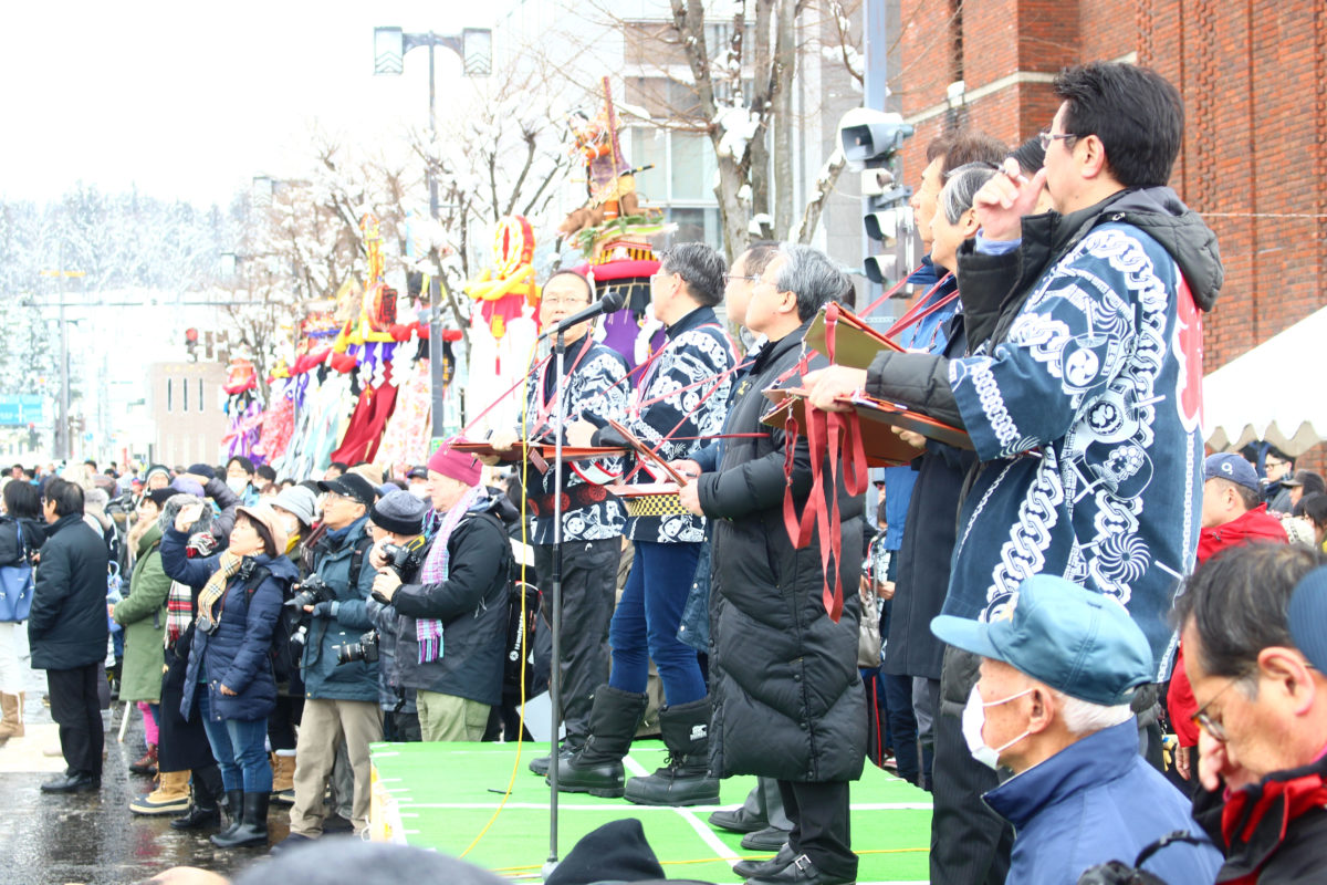一日目は横手市役所前に各町内、企業、同期会が工夫を凝らし作成したぼんでんが勢ぞろいし、梵天コンクールが行われました。