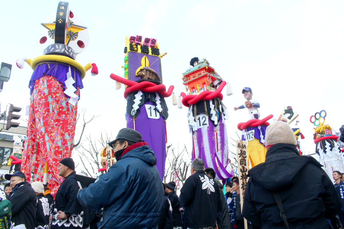 ぼんでんの見どころはその頭飾り。5mもある丸太の先に、しめ縄や干支飾りなど色彩豊かなに意匠を凝らした飾りが掲げられます。もともとこのぼんでん、幣束を遠くからでも見えるように大きく豪華になっていったんだとか。重さは30kgを越えるそうです。このぼんでんを勇壮に担いで練り歩く姿はかっこいいですね!