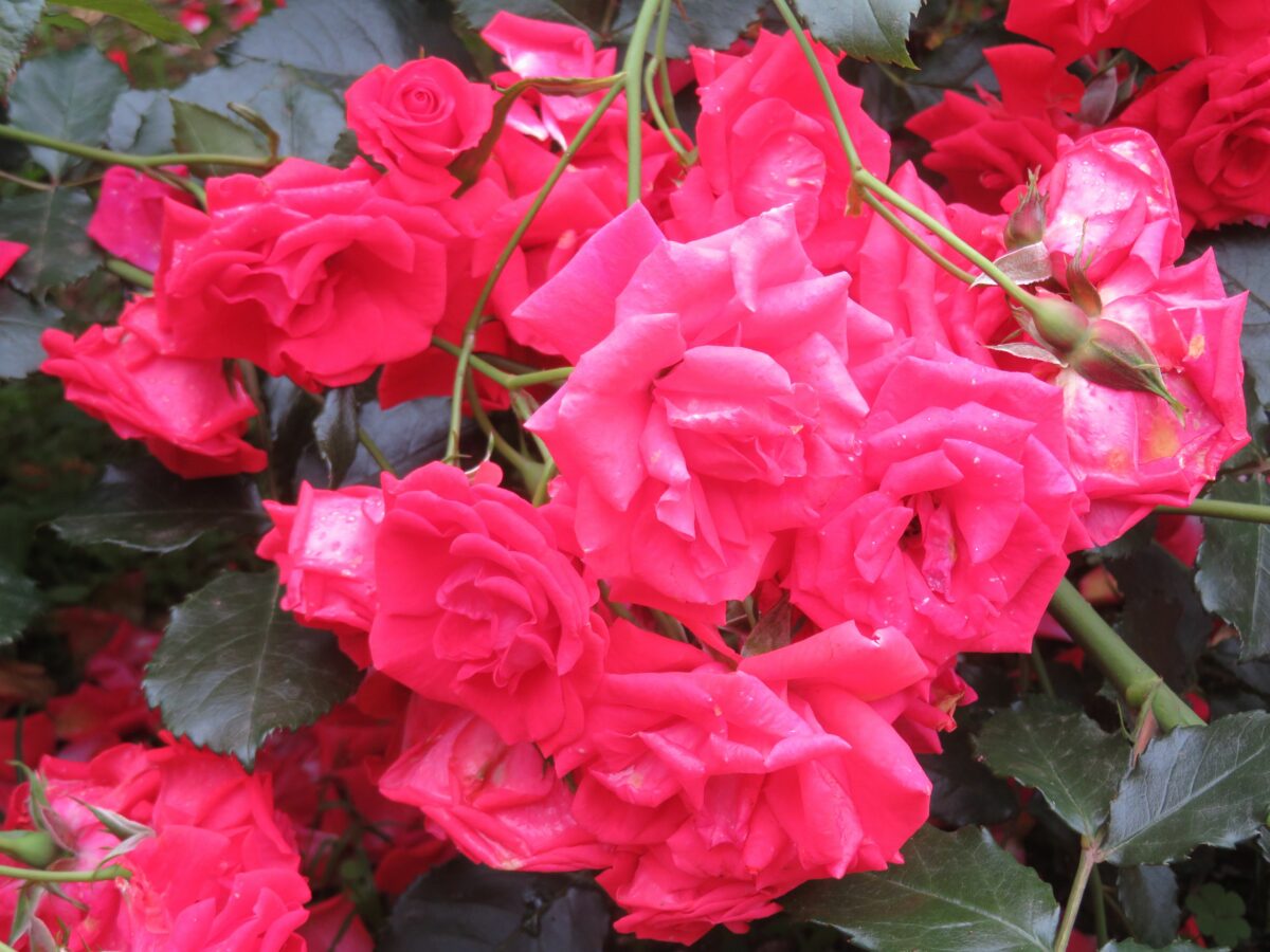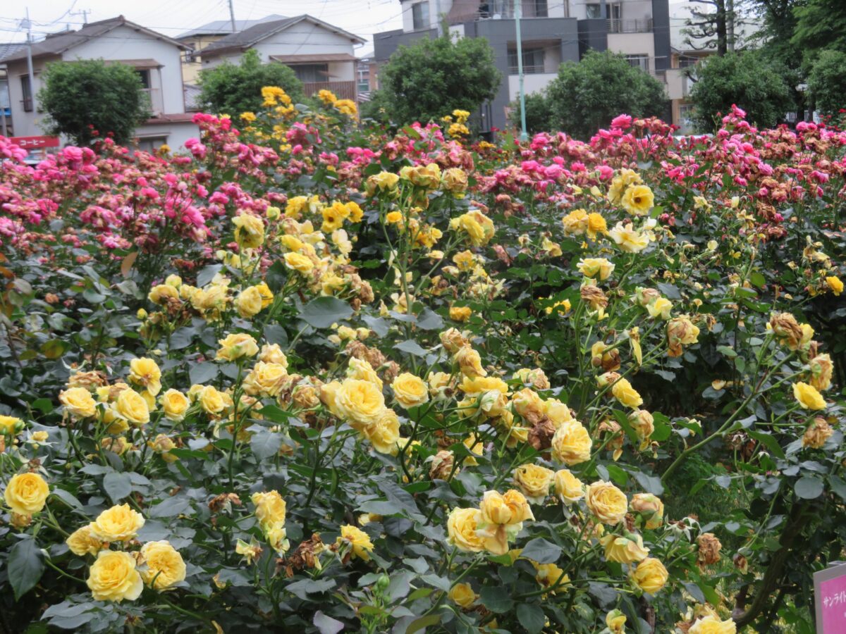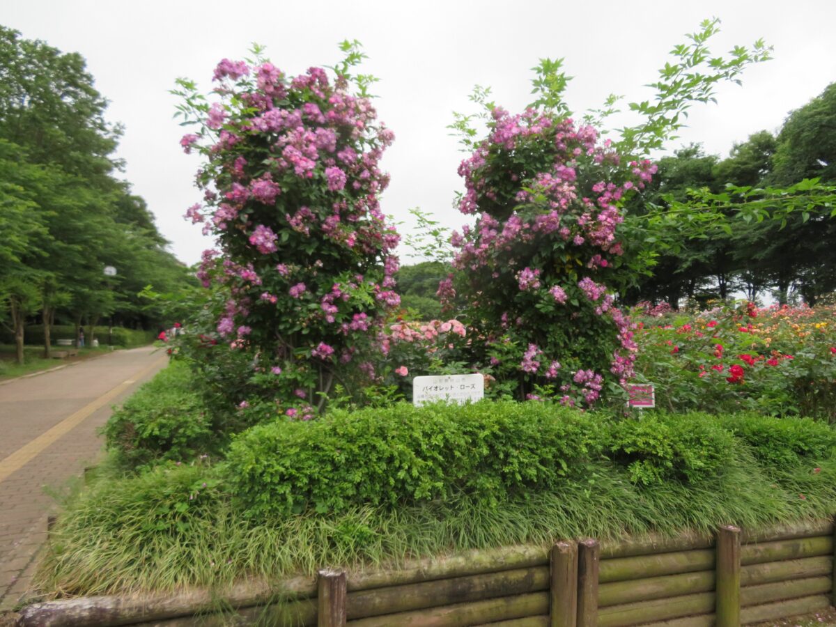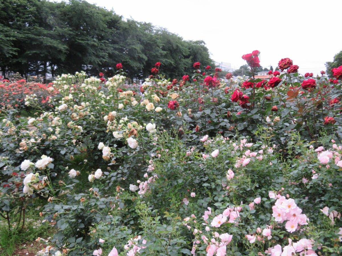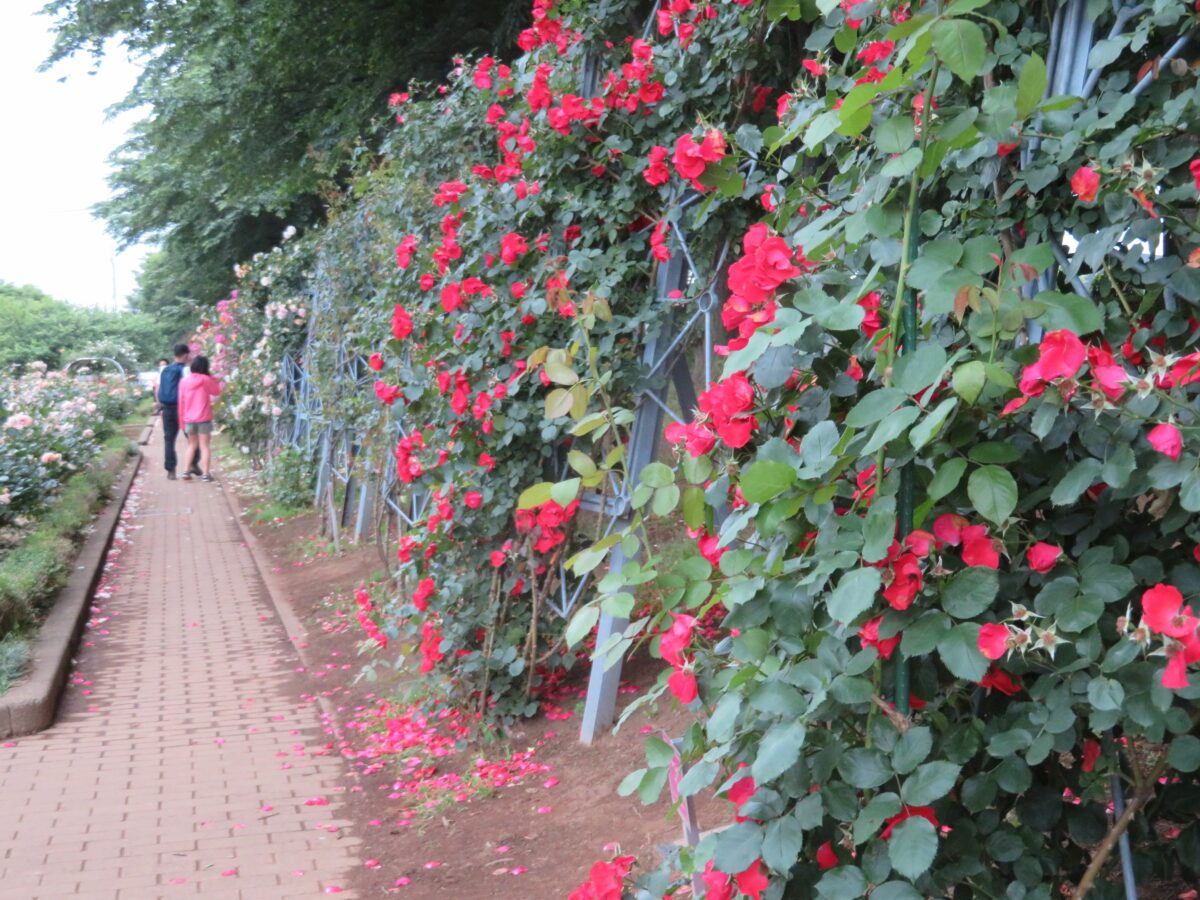 バラ園の西端は首都高速埼玉大宮線の高架路に沿って、ツルバラが花の壁を作ります。
