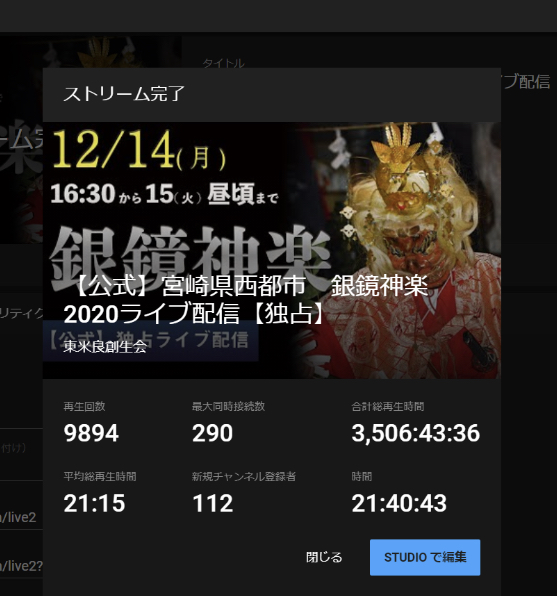 銀鏡神楽は、NPO法人東米良創生会を窓口にして、ライブ配信が行われました。三十三番ある舞いのうち、一番は前日に舞われるので、二番から三十三番までを配信1日目の16時30分から配信2日目の昼前までが完全中継されたのです。