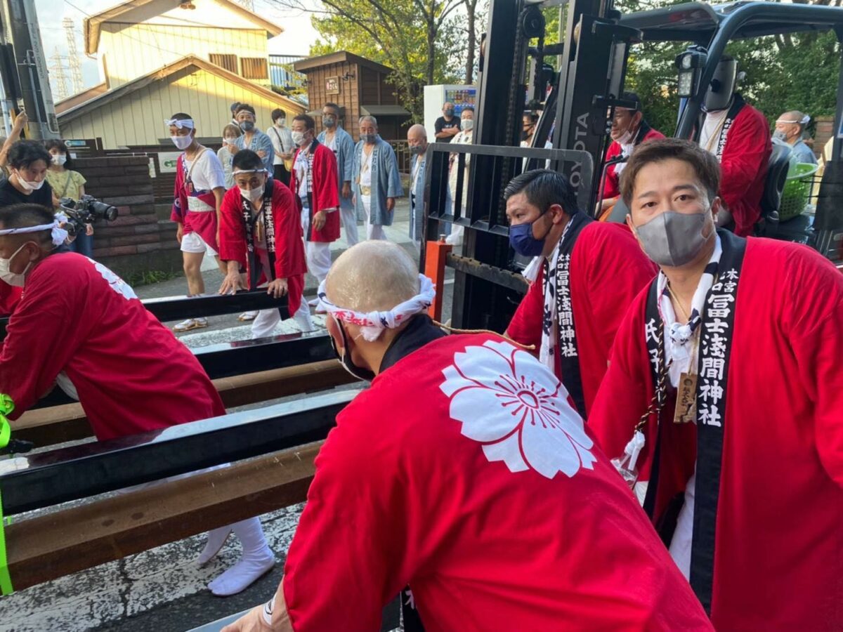こうして密を避ける工夫を凝らして行われた吉田の火祭りだが、神輿をフォークリフトに乗せる、また下ろす際には、どうしても人の手が必要になる。