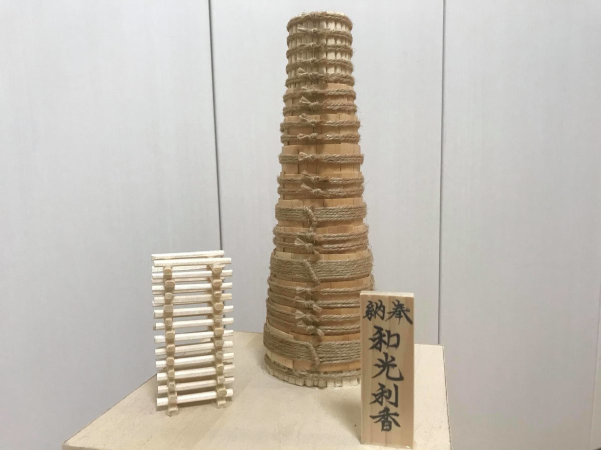 2019年に吉田の火祭りを取材させていただいた際、世話人OBの方がご好意で作ってくださったミニチュア松明。本物の10分の1のサイズで作られており、私の名前が入った芳名板まで忠実に再現されています。