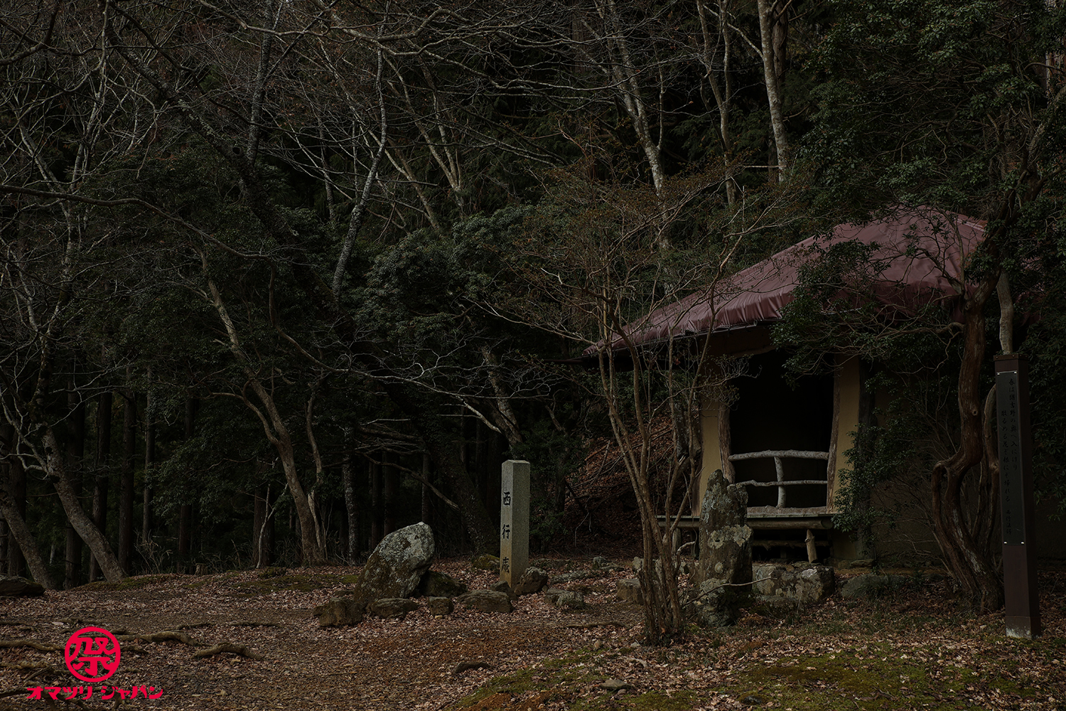 西行庵のある場所は吉野水分神社のさらに奥。金峯神社まではタクシーで来られます。そこから山の中に入り、手すりを伝って道なき道を進んで行きます。