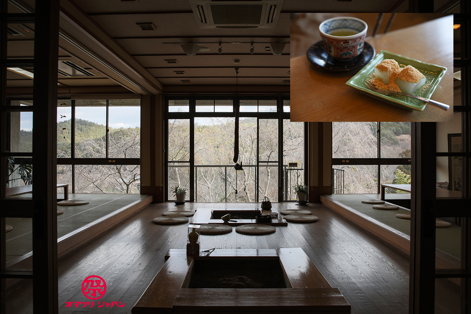 このいろりの間とお部屋から桜の景色が窓いっぱいに広がります。(※写真は節分に撮影。冬の景色です。)