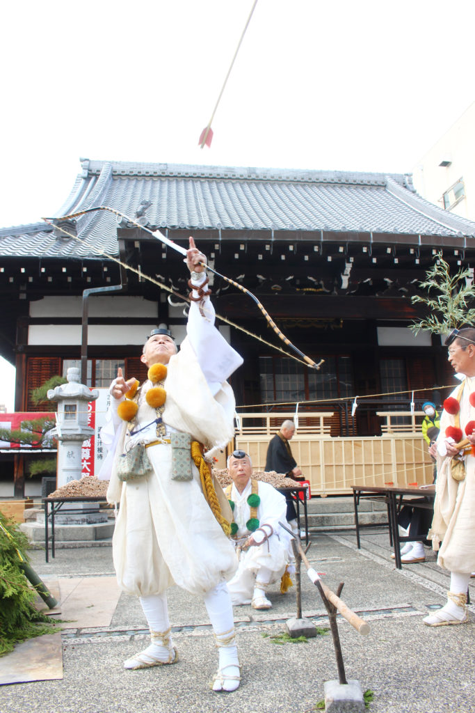 山伏が口上を述べて、天高く矢を放ちます!四方に何度か矢を放つのですが、観客ゾーンにら落ちてきて盛り上がる回もありました。#上徳寺 #世継地蔵尊大祭 #京都 #関西 #祭り #火祭り #山伏 #オマツリジャパン pic.twitter.com/h5JqJZ4AlB